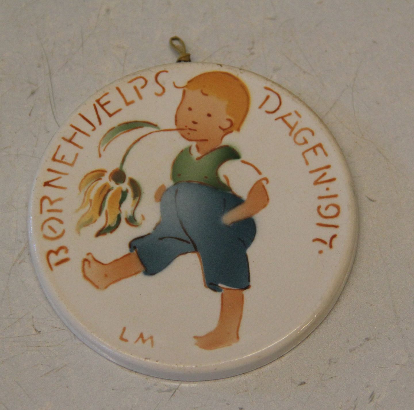1917 b Dreng med blomst Louis Moe 8,7 cm Royal Copenhagen Aluminia fajance Børnehjælpsplatte
