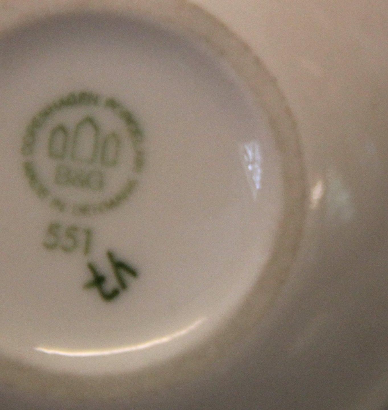 551 Sennepskrukke med låg 6 x 8 cm Olympia Bing & Grøndahl B&G Olympia: Kraftigt hvidt porcelæn med mønster med grønne streger, som Delfi, form 43 I fin og hel stand Bing & Groendahl Opkaldt efter Olympen i Det gamle Grækenland