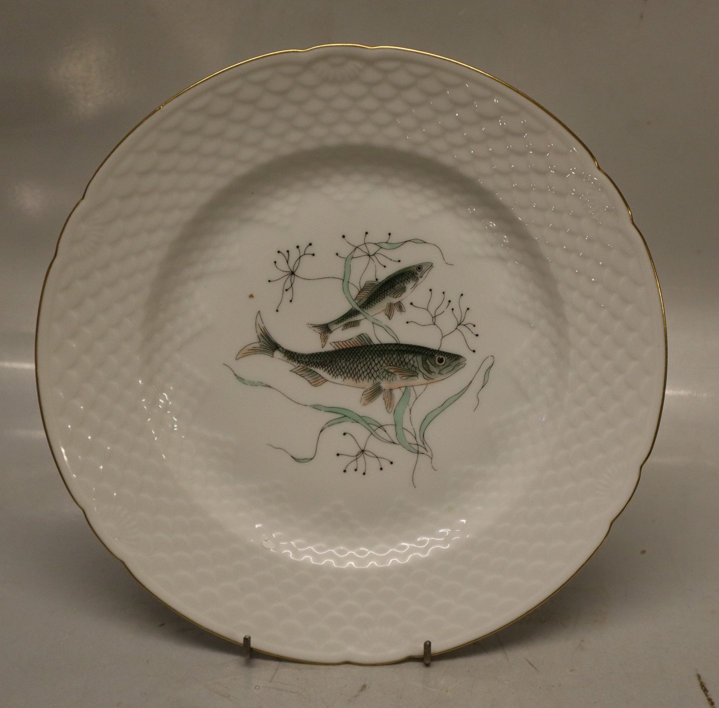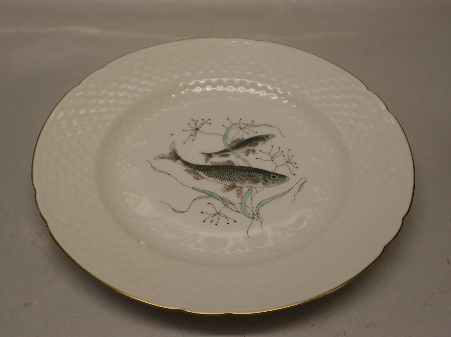 Fisketallerkenerne passer til andre mønstre på hvidt porcelæn med guldkant form 356: Hostrup, Hartmann, Erantis, Saksisk Blomst, Mimer, Heimdal, Ofelia, Ymer