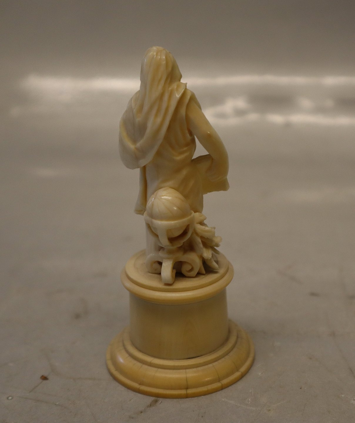 : Helgenindefigur med bog i udskåret ben. Sidste halvdel af det 19. årh.