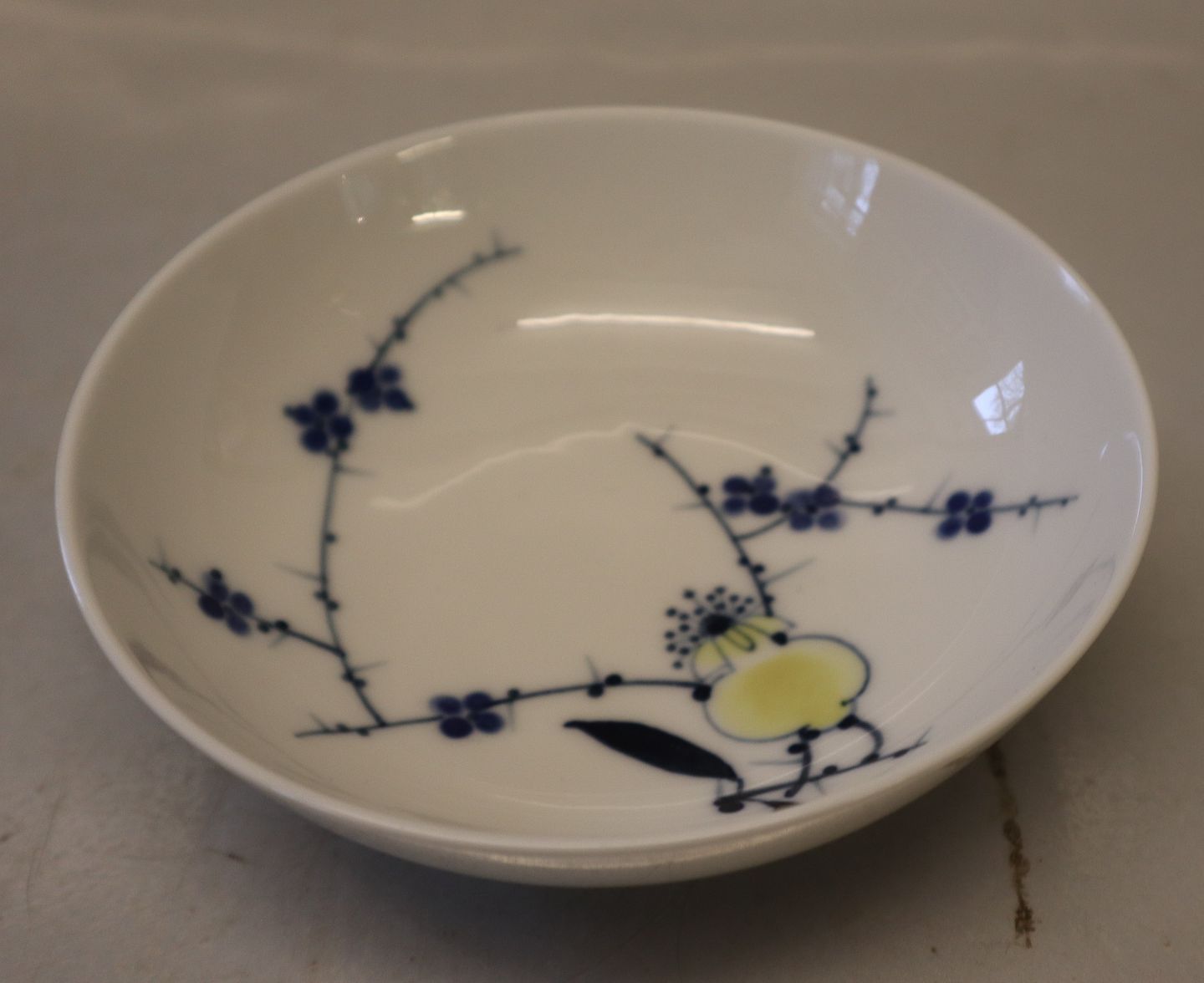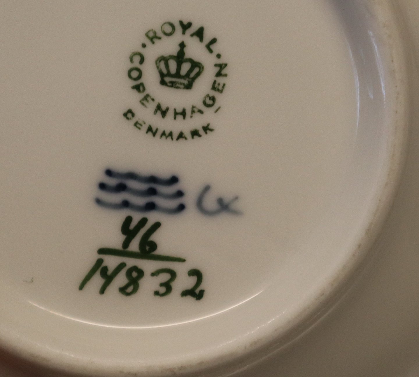 Royal Copenhagen Rimmon Design Johannes Hedegaard. I produktion fra 1967 - 1977. Rimmon er hebræisk for granatæble. Hvidt porcelæn med gul og blå håndmalede grene. Royal Copenhagen spise - og kaffestel