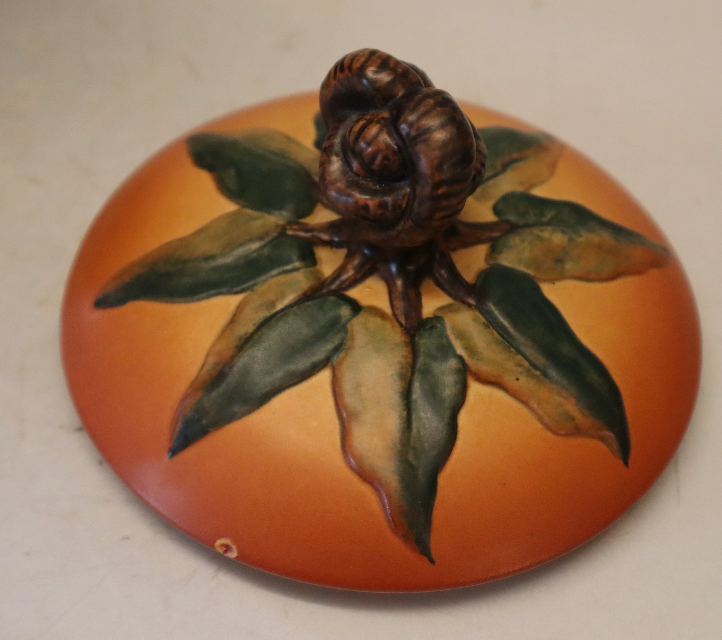 Beskrivelse: 703 Lågkrukke 25 cm Karen Hagen 1909 Keramik fra P. Ipsens Enke Kgl. Hof. Terracottafabrik 1843-1955 I god brugt stand med lille skår under låget