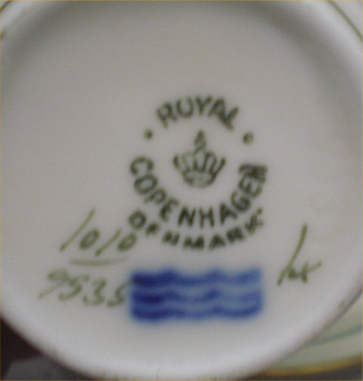 Kgl. 1010 Fensmark : Cremefarvet glasur, koralrød blomst med grønne blade, grønt bånd og guldfilet. Dekorationen med Rød Arve, populært kaldet "Grine til Middag" Det latinske navn: Ana Gallis Arvensis. Design Thorkild Olsen før 1961