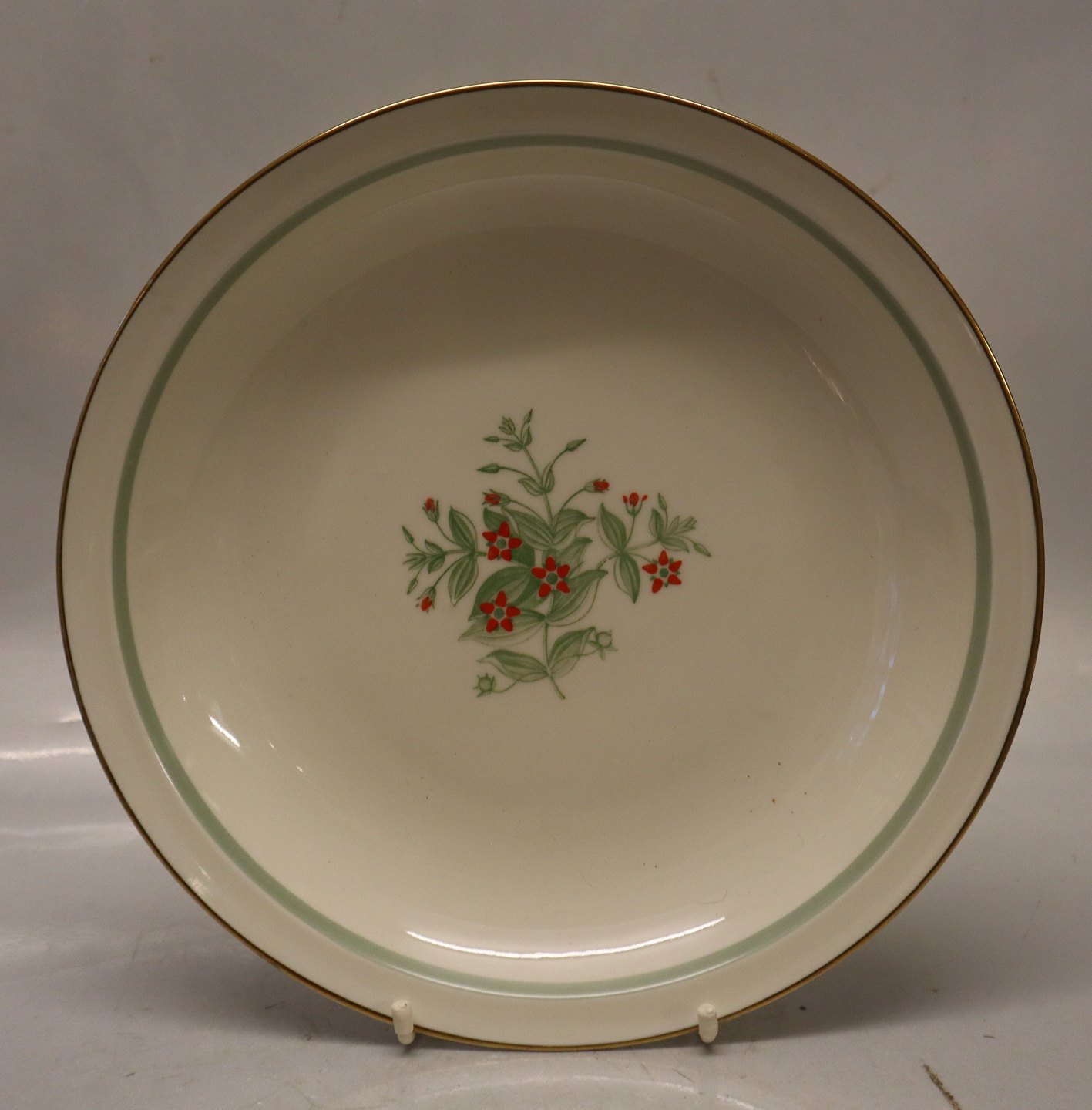 Kgl. 1010 Fensmark : Cremefarvet glasur, koralrød blomst med grønne blade, grønt bånd og guldfilet. Dekorationen med Rød Arve, populært kaldet "Grine til Middag" Det latinske navn: Ana Gallis Arvensis. Design Thorkild Olsen før 1961