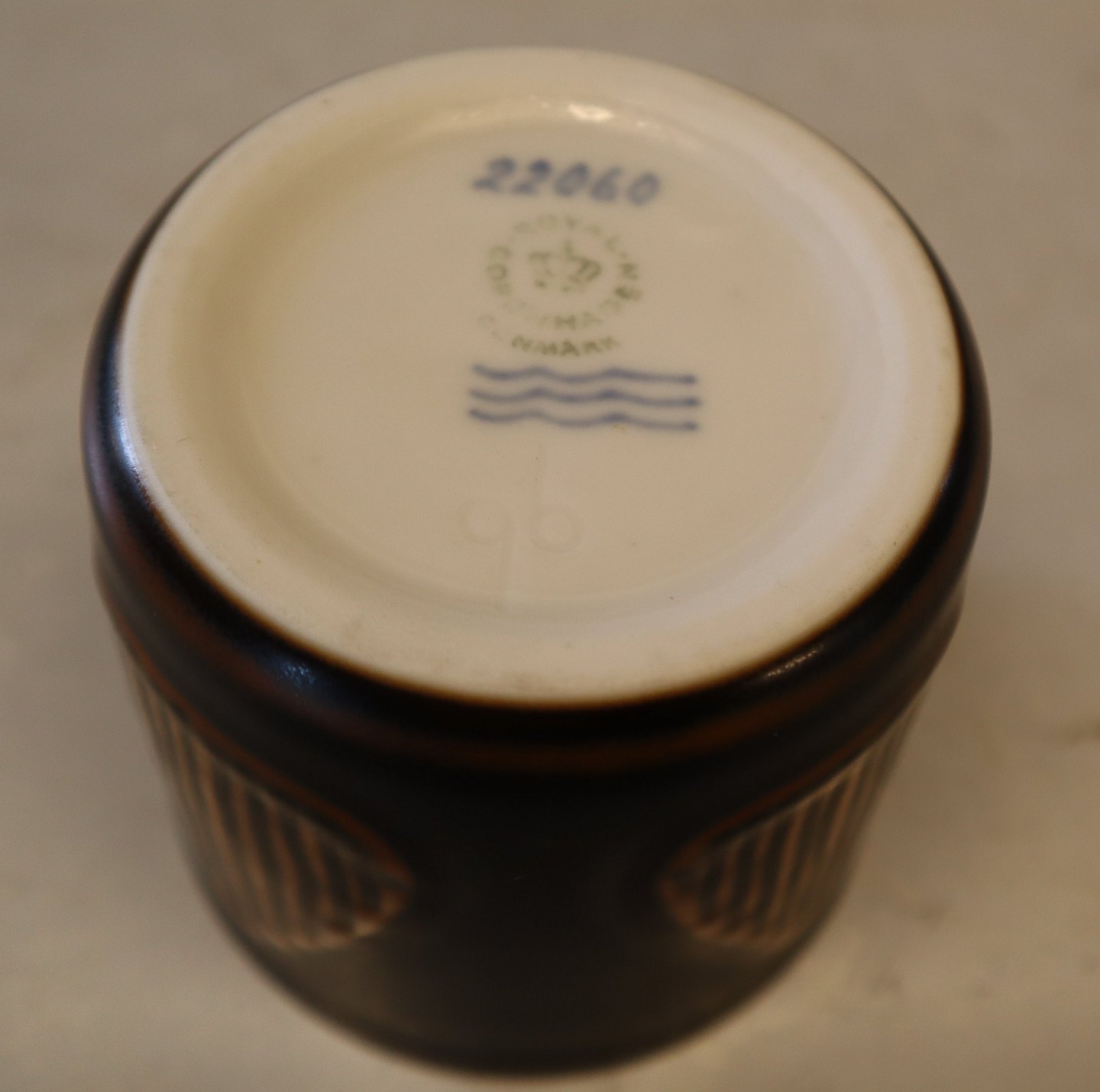 Beskrivelse: 22060 Kgl. Rund Vase - bæger med relief 7.5 x 8 cm Gerd Bøgelund Sept. 1963 Brun Bjørneglasur Royal Copenhagen stentøj I fin og hel stand