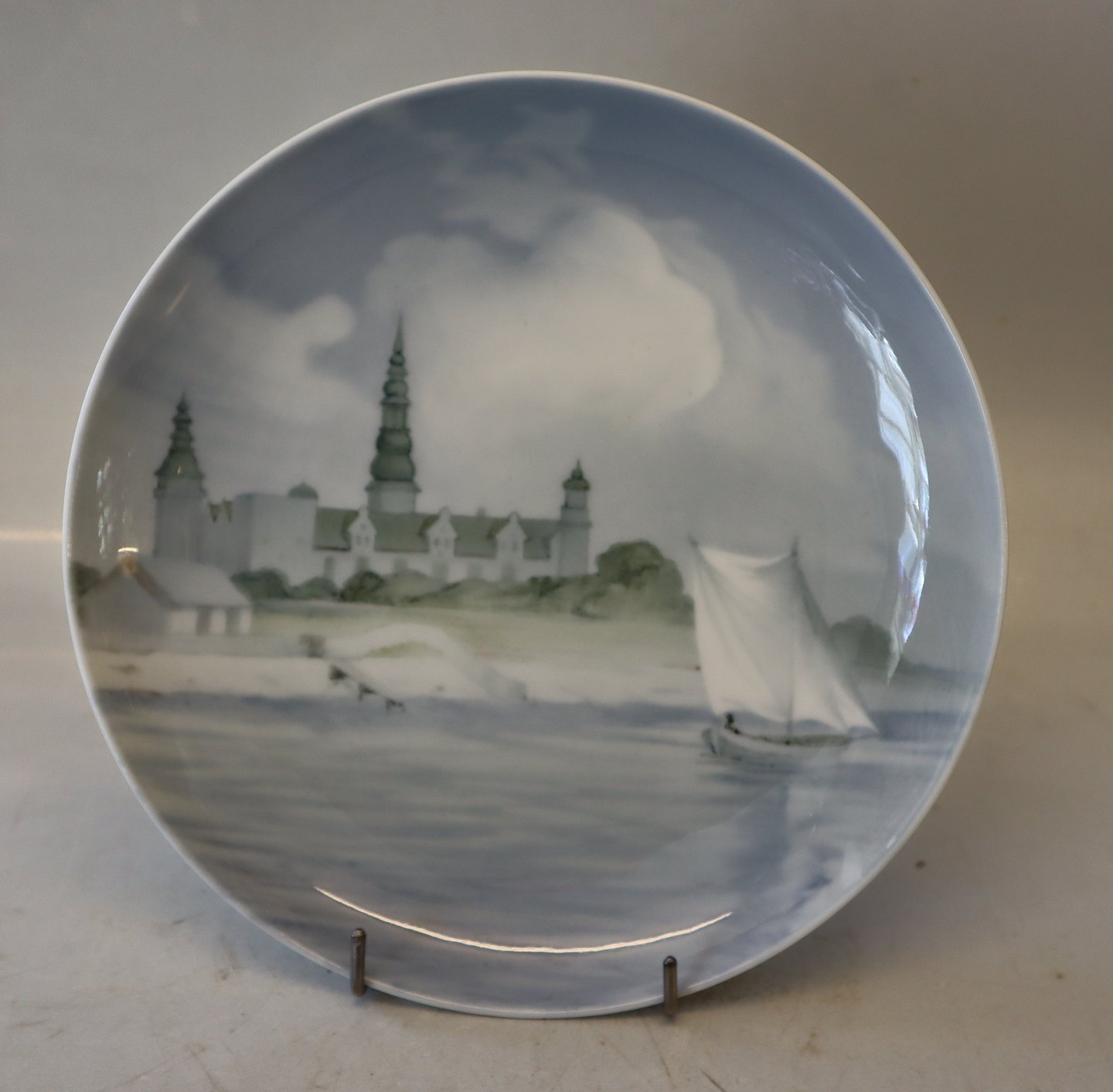 Beskrivelse: B&G 4033-357-20 Platte: Sejlbåd ud for Kronborg 20 cm Signeret KB