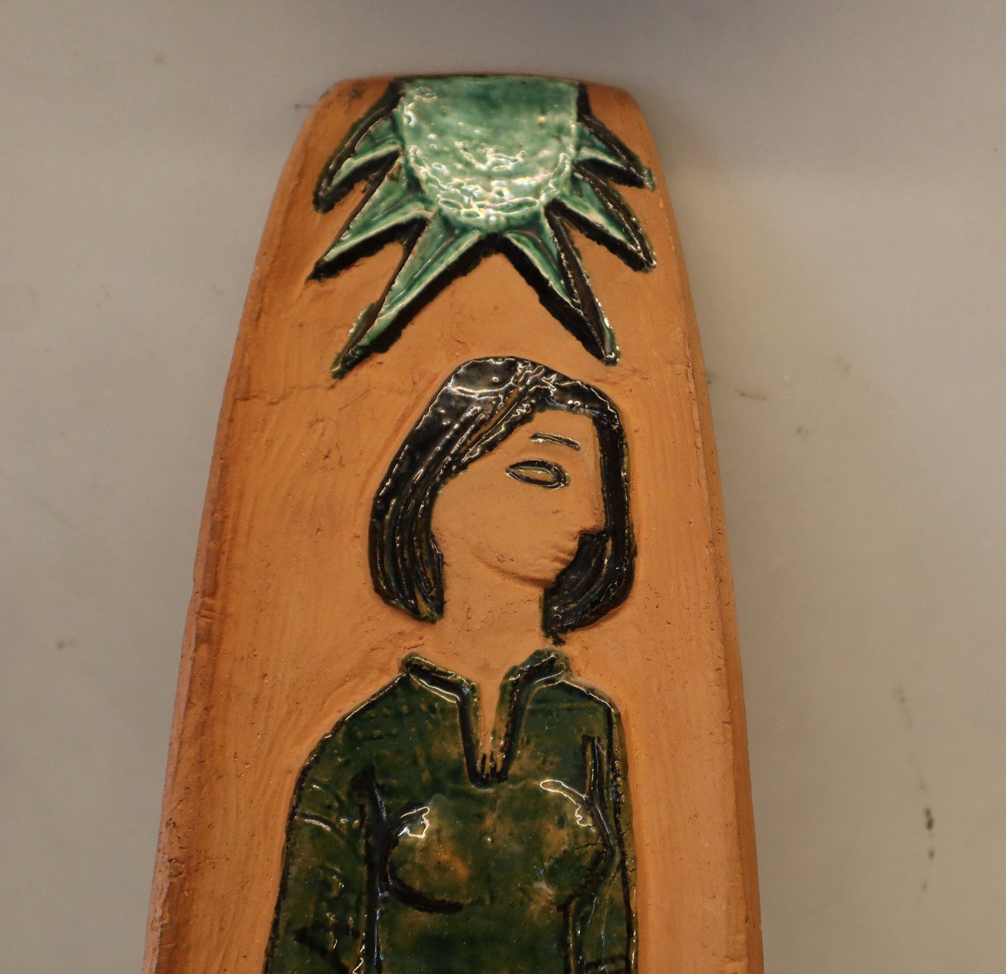Dansk Stentøjsrelief 49 x 12 cm Helge Christoffersen Kvinde i Grønt og Harlekintern