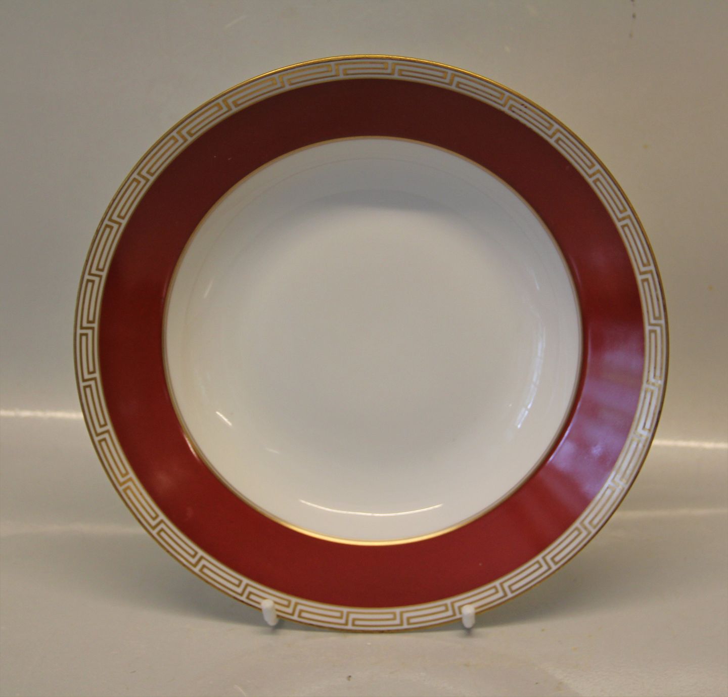 022 Stor dyb tallerken 24 cm (322) Wagner B&G Rustrød fond, åben guld à la grecque bort og guldkant, hvid