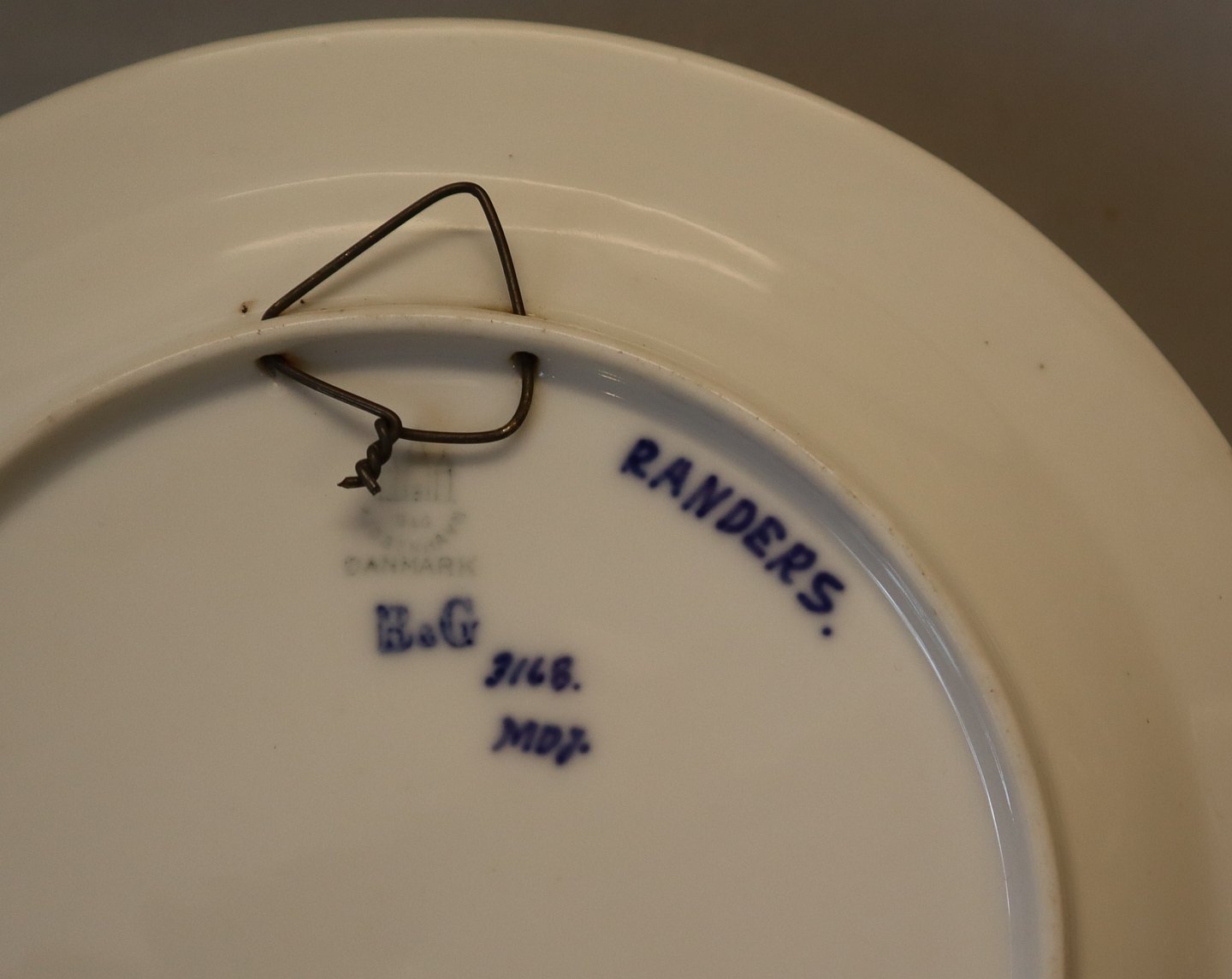 Beskrivelse: B&G Randerusiæ Insignia Civitat Byplatte med byvåben Randers Randers Bro med tre tårne Signeret MDJ 24.2 cm Martha Dahl Jensen Bing & Grøndahl