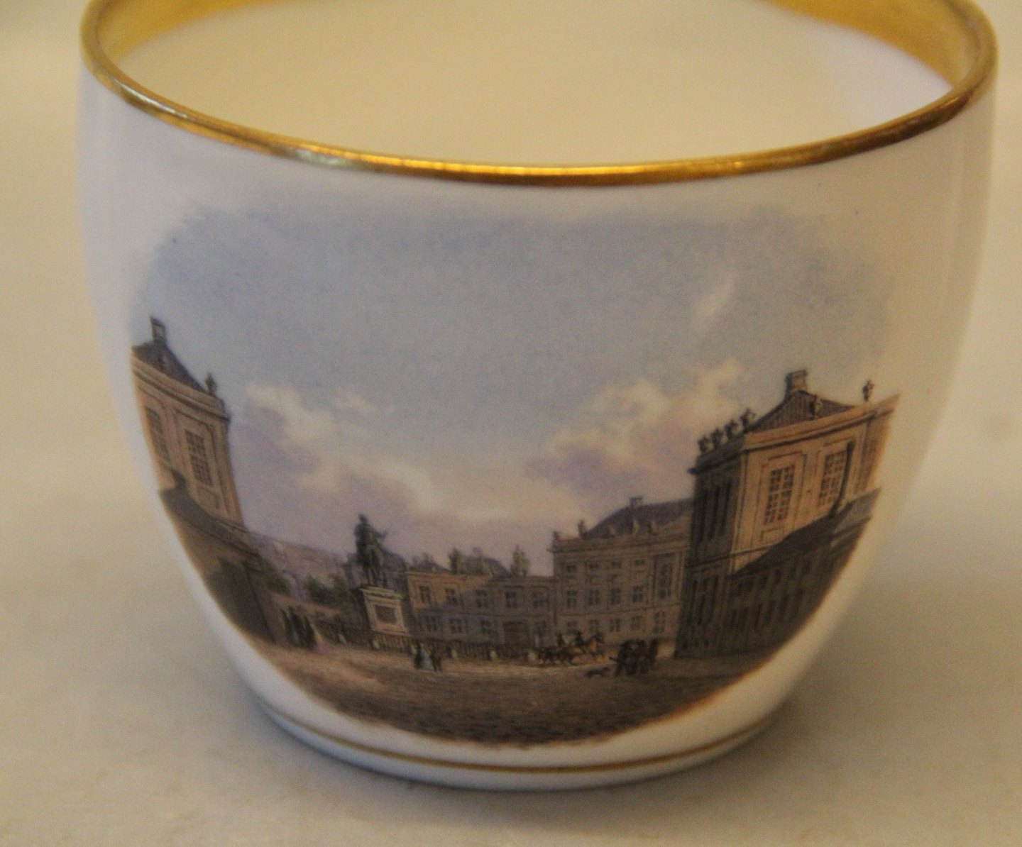 Beskrivelse: Amalienborg set fra Frederiksgade Kgl. Antik Højhankskop 6.3 x 8 cm (hanken 8.5 cm) og underkop 14 cm Kgl. Prospektkop fra Royal Copenhagen Topografisk maleri fra 1800-tallet .I fin stand med aldersrelateret slid på guldkanter
