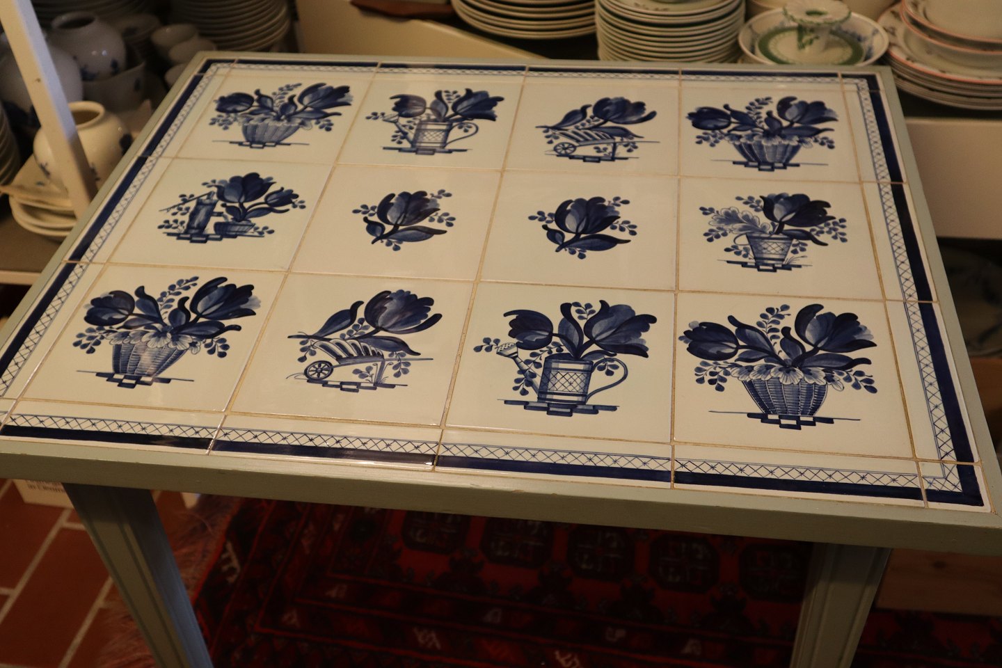 Flisebord 59 cm høj 56 x 71.5 cm Royal Copenhagen Aluminia Tranquebar I fin og hel stand Fliserne kan være 1051-3026,1051-3027 Stellet er produceret på Stolefabrikken Odense Made in Denmark
