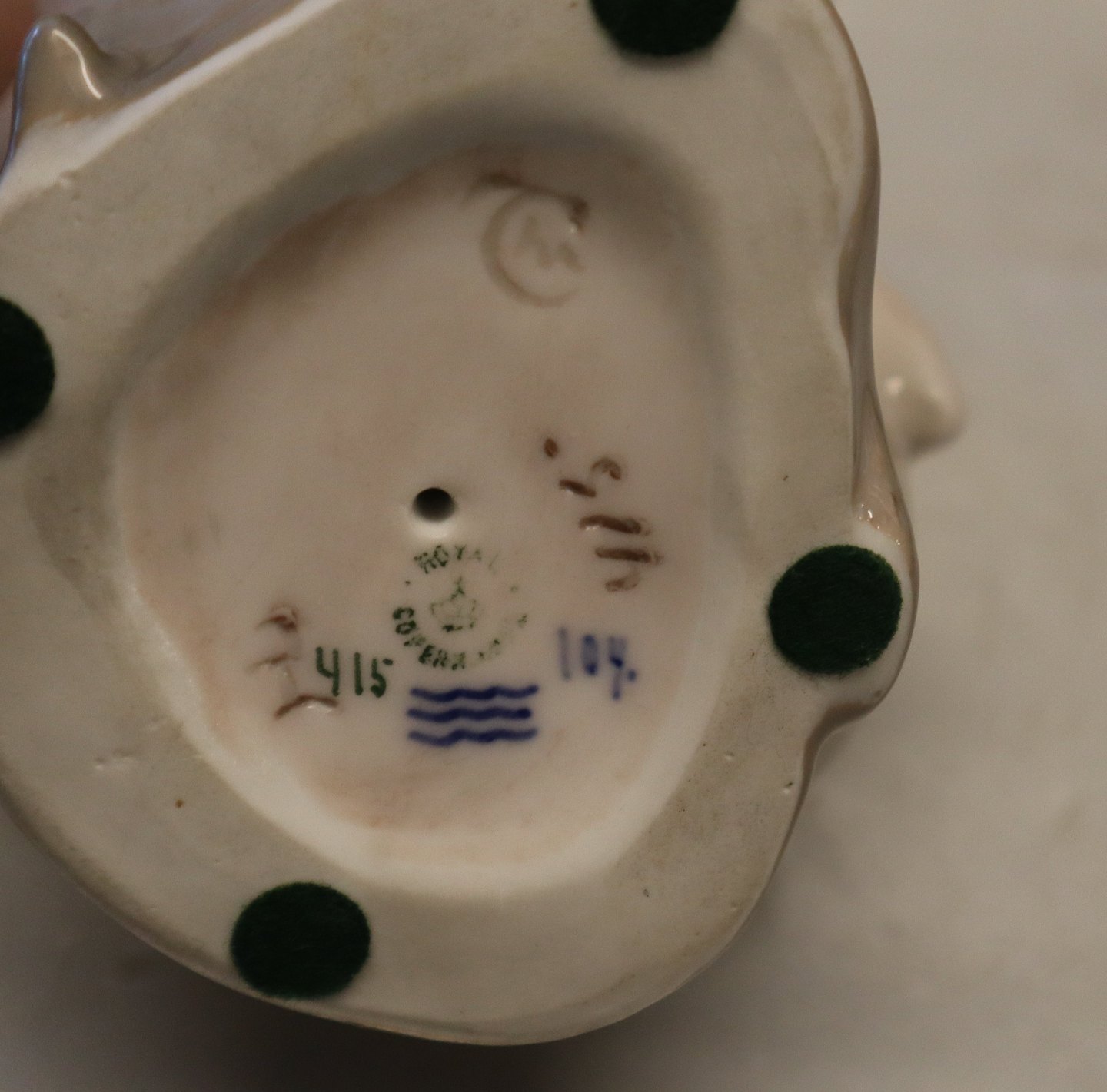 Beskrivelse: Royal Copenhagen 415 Kgl. Abepar Chr. Thomsen 1903 13 cm Farvekode 1454 2. pga af nogle blå stænk se billede i hel og fin stand