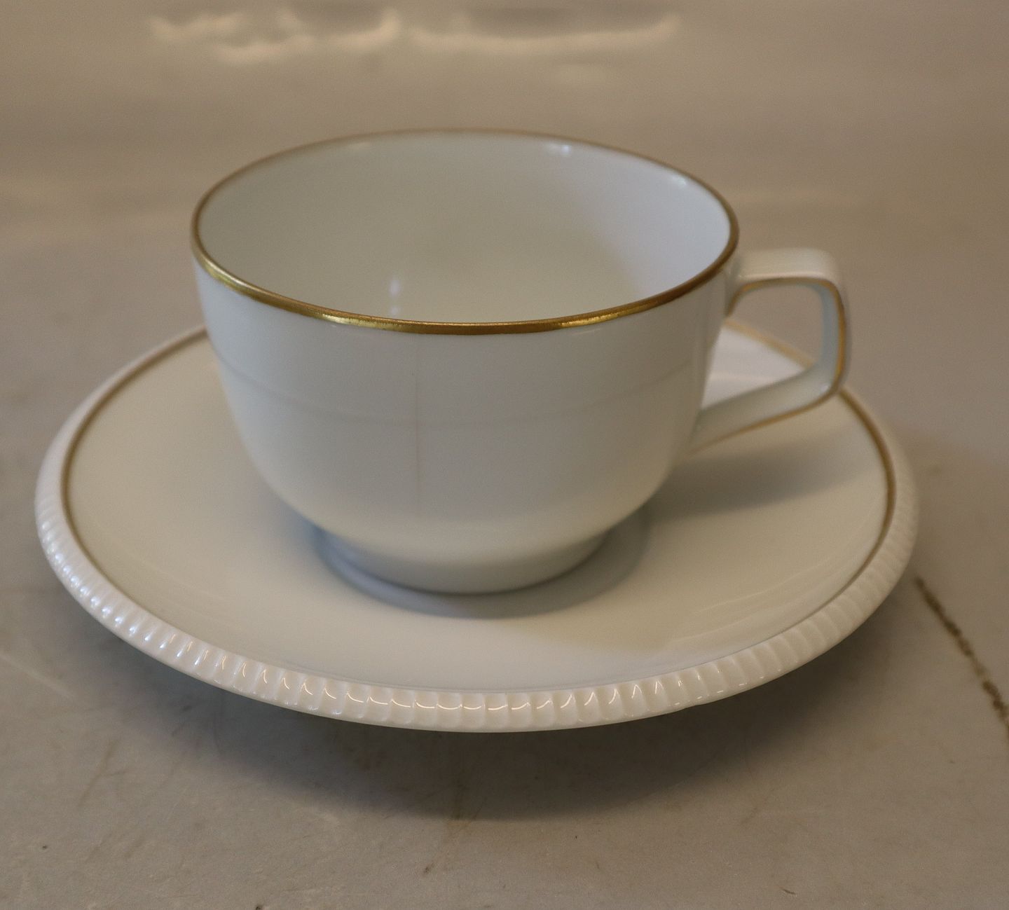 103 Chokoladekop & underkop 15.2 cm Vega B&G med smal guldbelægning på inderkanten . Form 674 er formgivet af Sigward Bernadotte. Denne form findes i hvidt, med bred guldkant (Gylden Sol), med grønt og guld (Perseus), med rødt og guld (Herkules) og grå og guld (Norma).