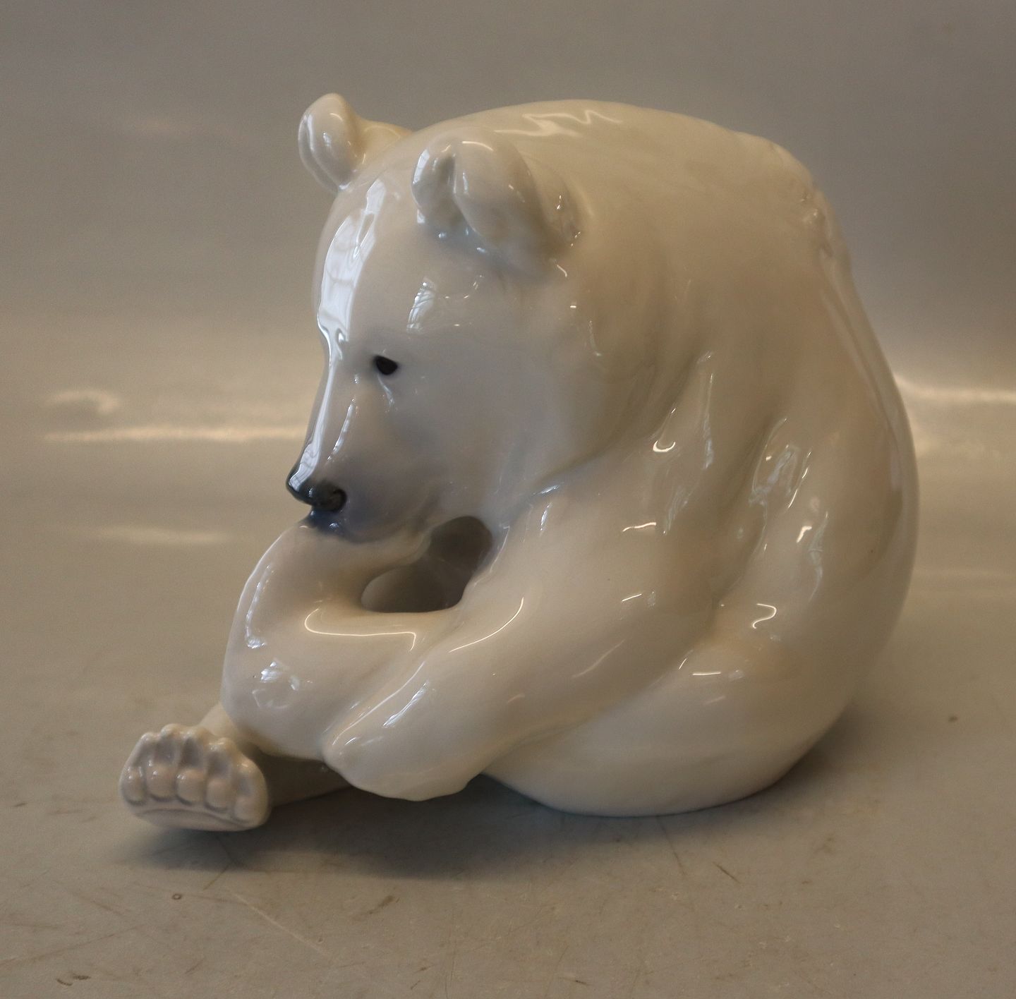 Beskrivelse: 0351 Kgl. Hvis bjørn tyggende på sin fod! , Erik Nielsen 1901 16 cm fra Royal Copenhagen I hel og fin stand