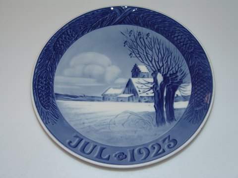 Beskrivelse: Royal Copenhagen Juleplatte (Kongelig, kgl) fra 1923 "Snelandsab med Kirke". Designed af Oluf Jensen. I fin og hel stand. Første sortering.