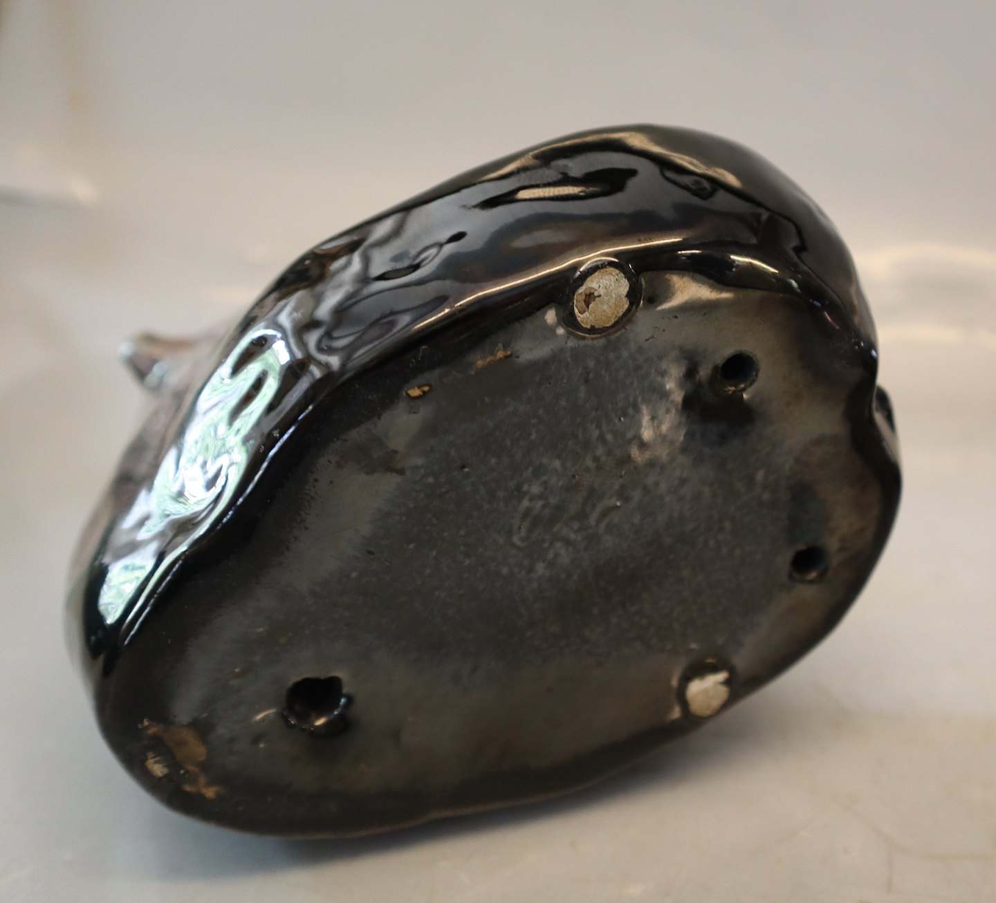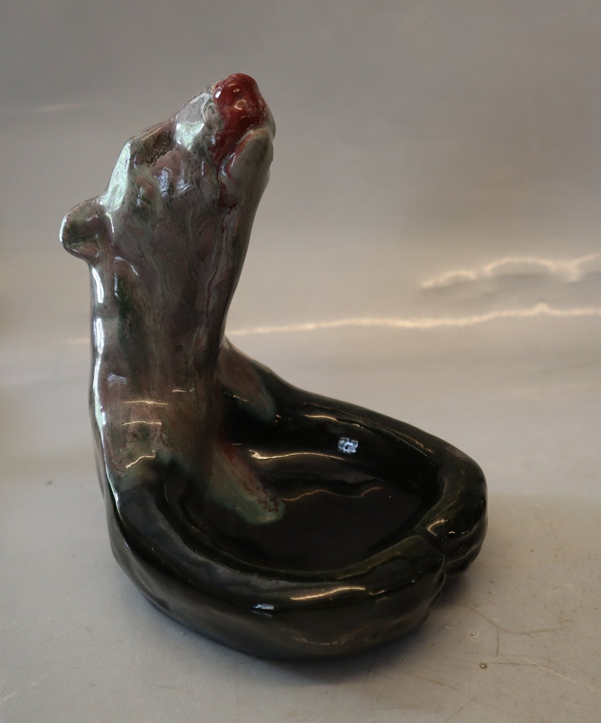 MA.S Majolika Bjørneskål 16.5 x 14 cm Grønlig og rødlig lustra flydeglasur Bornholmsk Keramik
