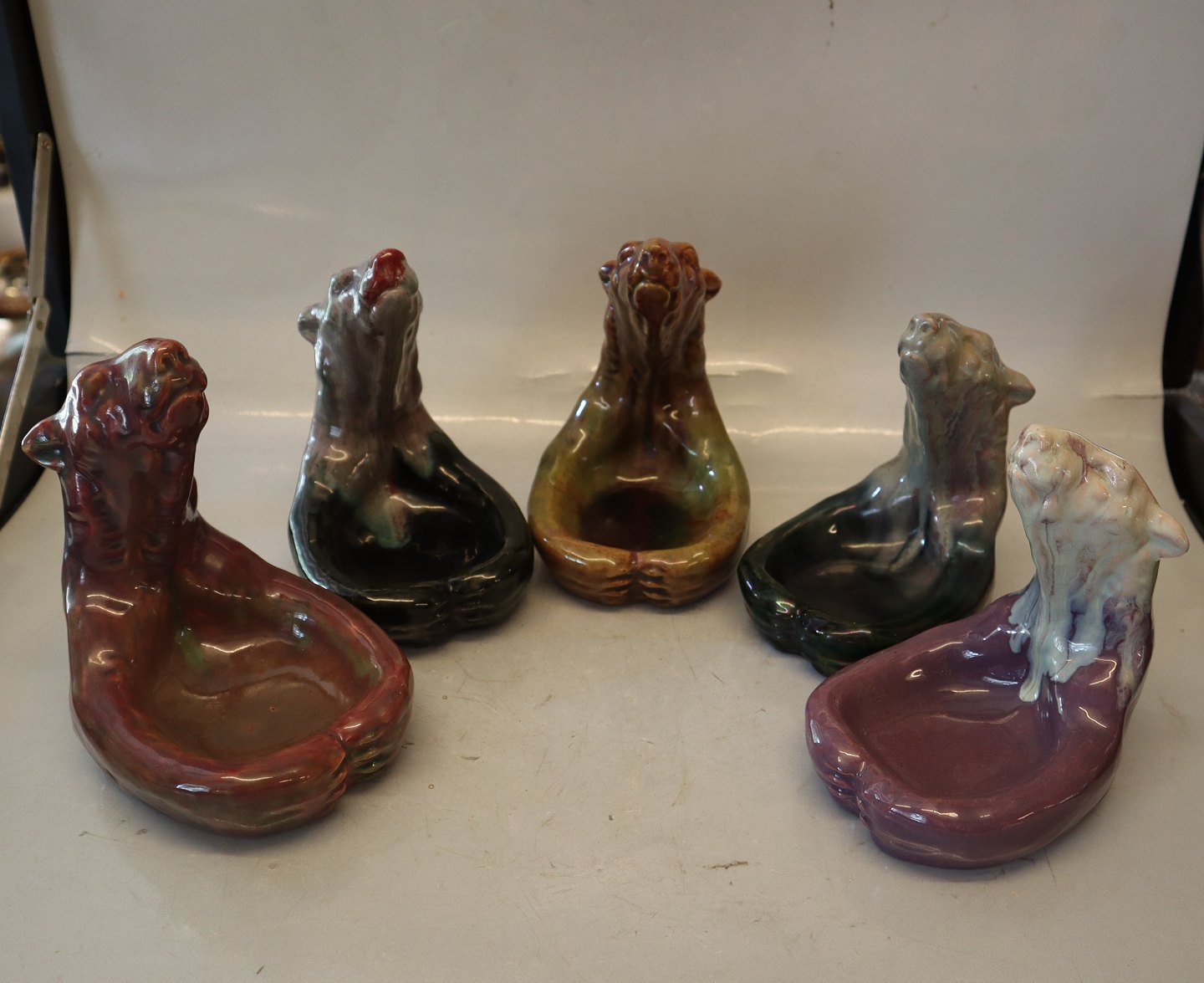 Beskrivelse: 1 stk på lager MA.S Majolika Bjørneskål 16.5 x 14 cm Grønlig og rødlig lustra flydeglasur Isbjørn