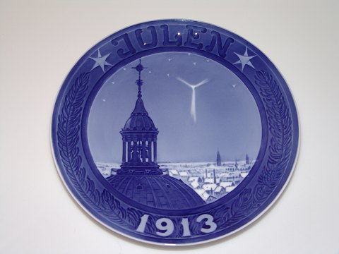 Beskrivelse: Royal Copenhagen Juleplatte (Kongelig, kgl) fra 1913 "Spiret på Marmorskirkens kuppel og julestjerne over byens tage". Designed af Arthur Boesen. I fin og hel stand. Første sortering.