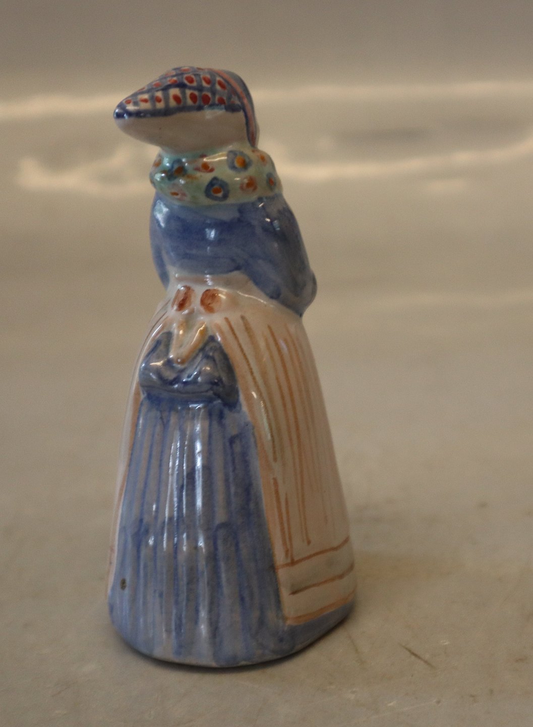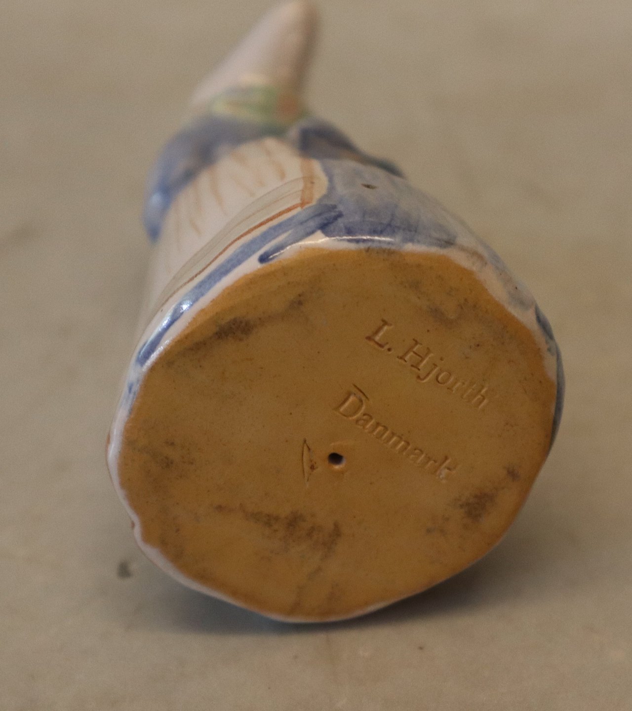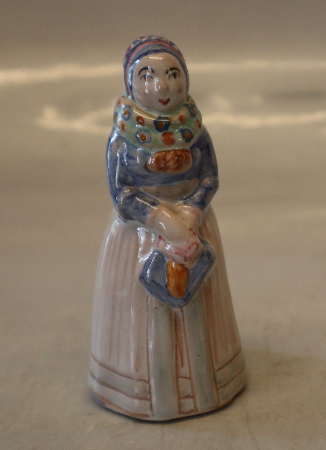 Beskrivelse: L. Hjorth miniature kvinde med taske 9 cm Bornholmsk keramik i pastelfarver L. Hjorth Bornholm i fin og hel stand