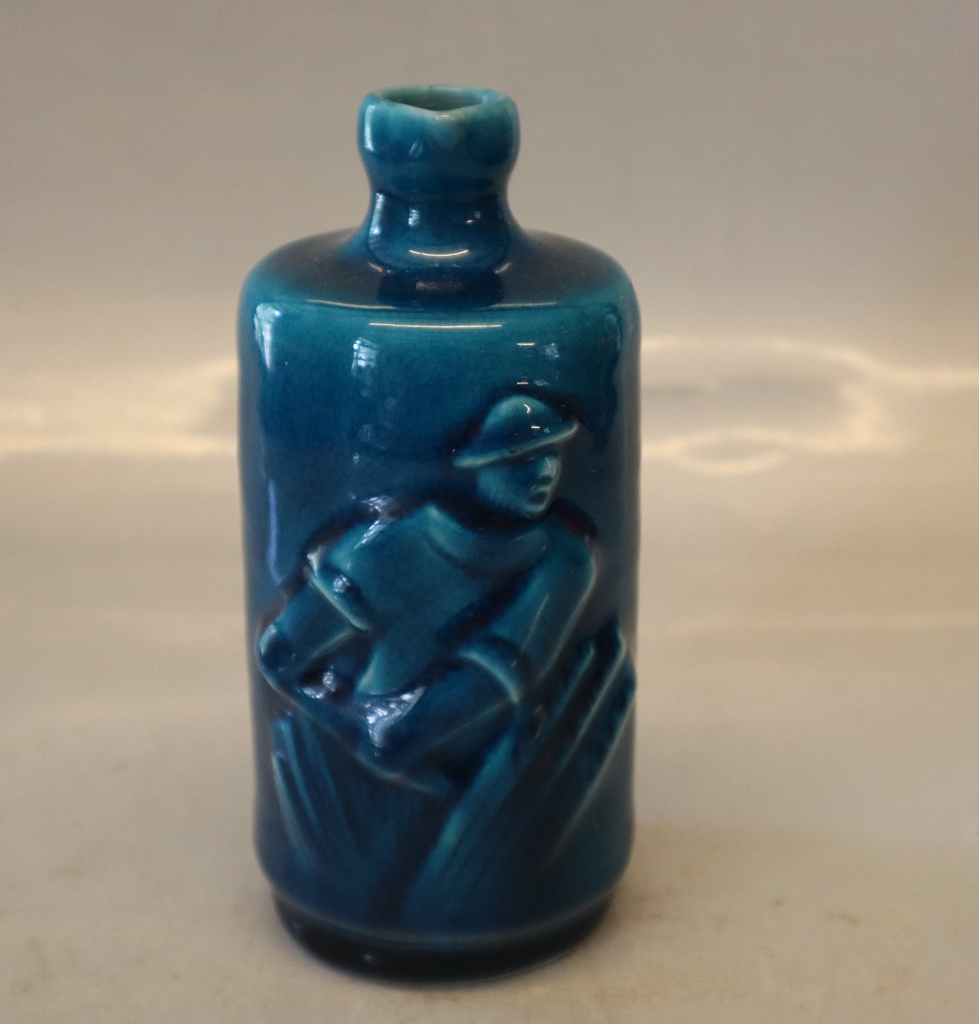 RC Turkis flaske 14 cm med releif af høstfolk Signeret Jais Kongelig Dansk Stentøj
