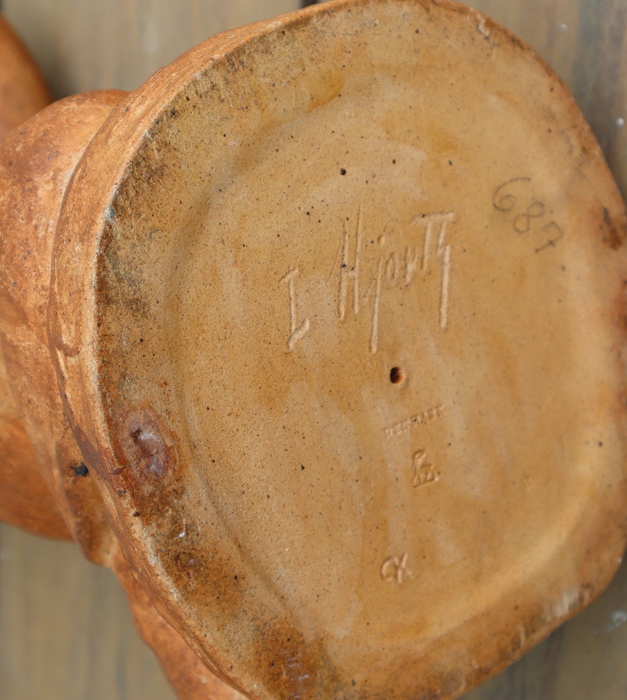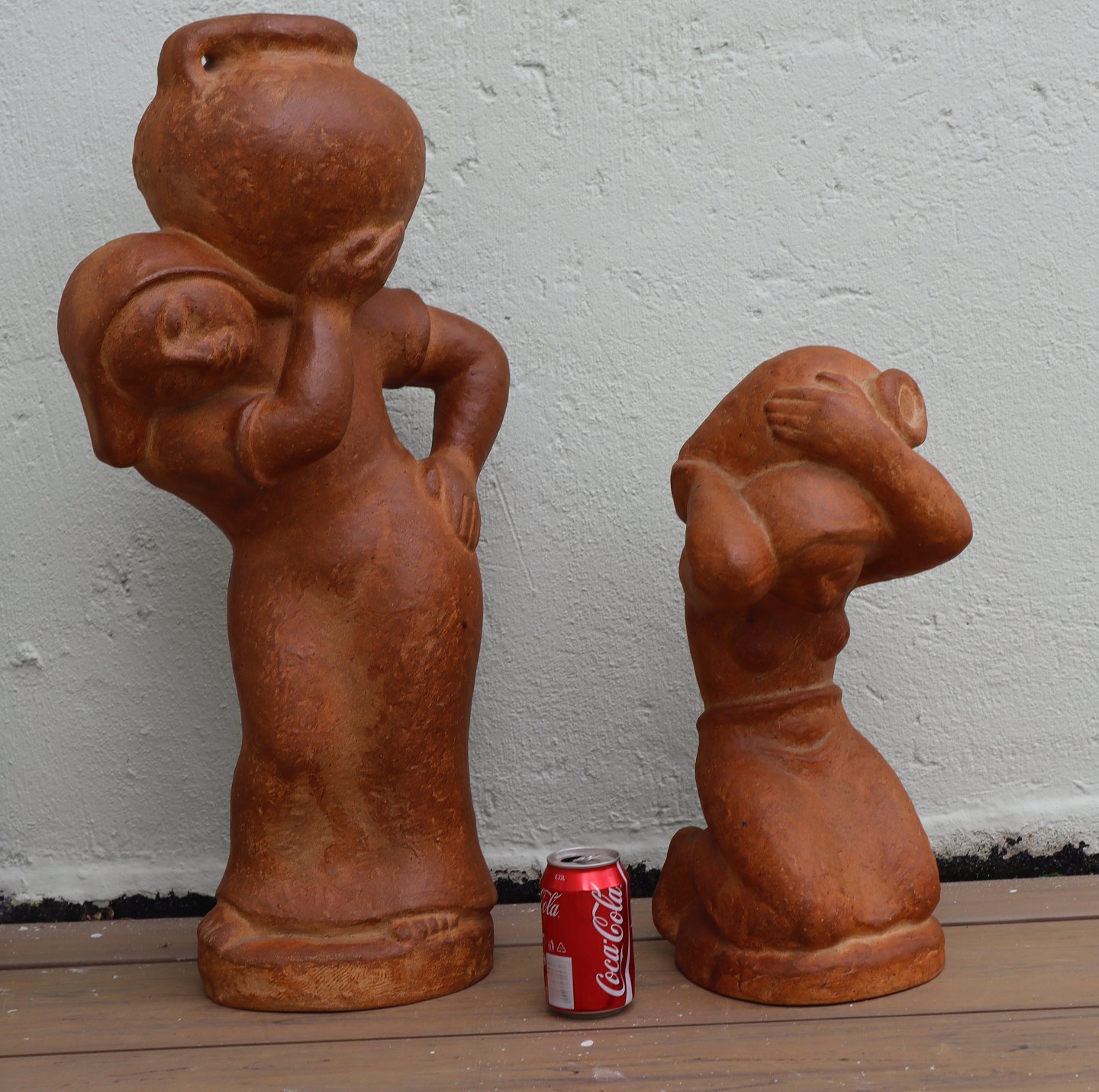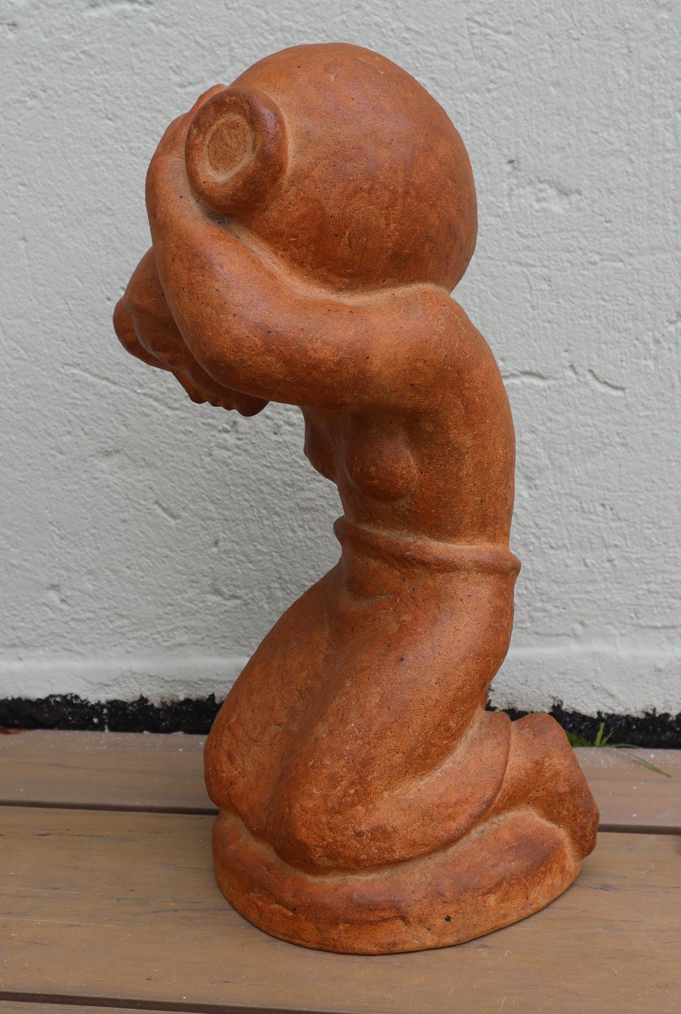 Beskrivelse: L. Hjorth 601 Kæmpefigur af knælende kvinde med krukke 49 cm 687 Gertrud Kudielka Lauritz Hjorth Bornholm Terrakotta