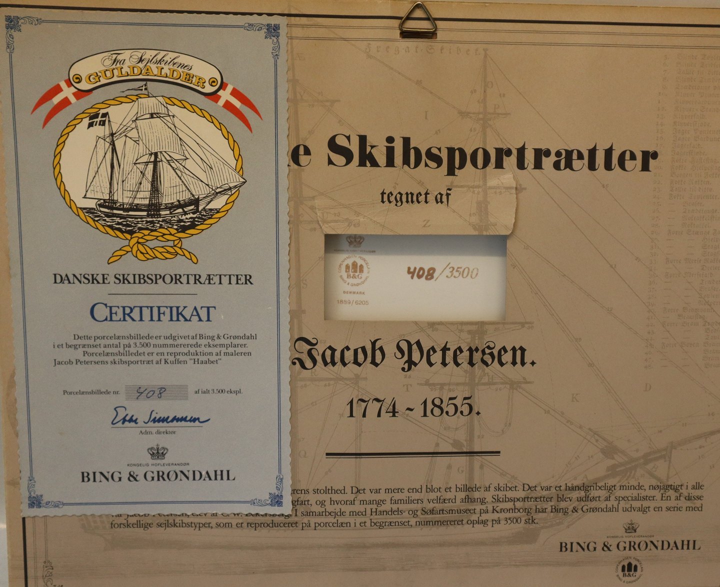Description: Danish Marine Paintings on a porcelain plaque by Jakob Petersen. 1774 - 1855 The good ship "The Hope of Copenhagen - sailed by Capt. C. Christiansen 1840. no 408 - 3500 Bing and Grondahl gold framed porcelain painting Marked with the three Royal Towers of Copenhagen. Bing & Groendahl In mint and nice condition