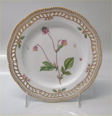Beskrivelse: Flora Danica fra Den Kongelige Porcelænsfabrik RC 20 - 3554 - 3533 Geum rivale L Fad til lille rund frugtkurv, flad tallerken med gennemskåret bort 23 cm.