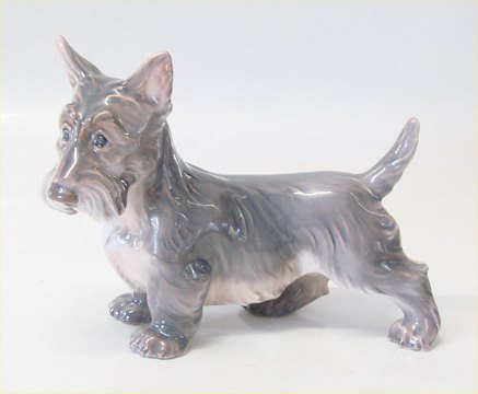 Beskrivelse: Dahl Jensen. 1066 Skottehund stående (DJ) 17 cm Mærket med kongelig krone og DJ Copenhagen 2. sortering i hel og fin stand. (1. sortering haves 1900 DKK)