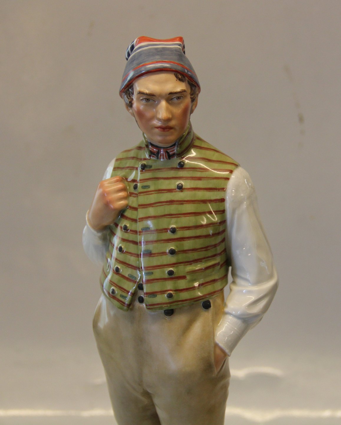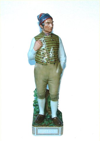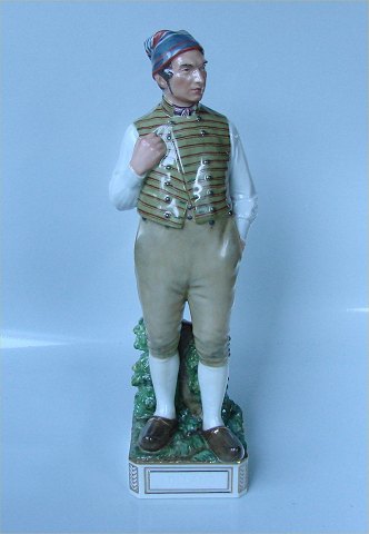 Beskrivelse: Overglasur egnsfigur fra Royal Copenhagen 12229 Ung mand fra Lolland 33 cm 1. sortering I hel og fin stand. Carl Martin-Hansen (1877-1941)