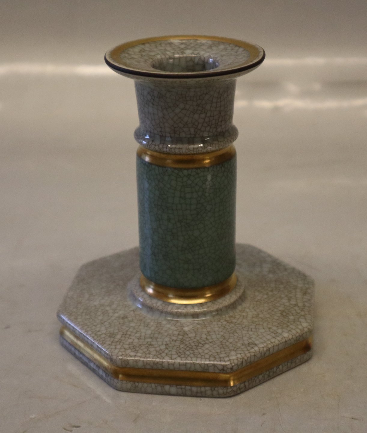 Beskrivelse: 458-3303 Kgl. Lysestager grøn, grå og guld 10,5 cm Kgl. Craquelé fra Royal Copenhagen I hel og fin stand