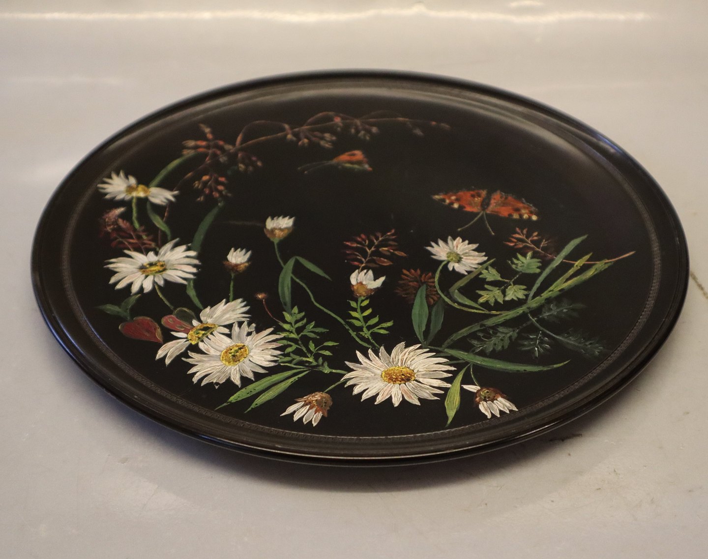 108 Bemalet fad eller platte 27 cm i sort terracotta Blomster og sommerfugle ca 1890 P. Ipsens Enke