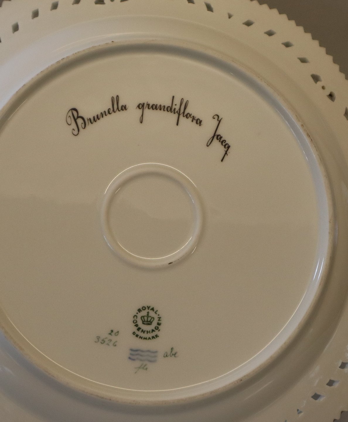 20-3526 "Brunella Grandiflora Jacq" Dækketallerken 27.4 cm (0380) med gennembrudt kant Kongelig Dansk Porcelæn Flora Danica