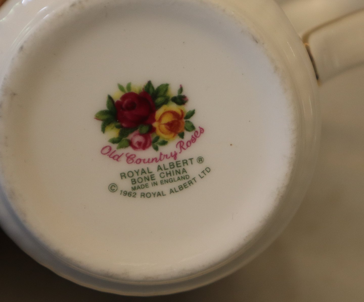 Krus 10 cm Landsbyrose Royal Albert Old Country Roses Bone China England. I God brugt stand