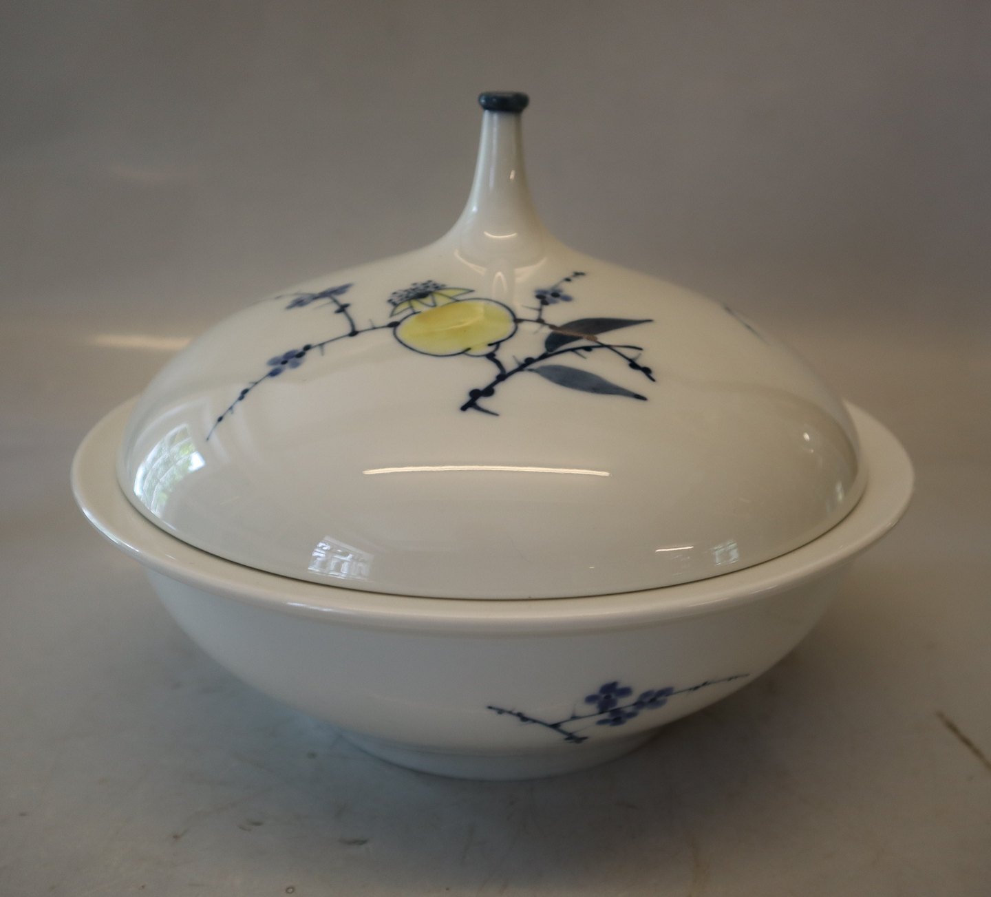 46-14801 Lille terrin 17.5 x 22.3 cm Royal Copenhagen Rimmon Design Johannes Hedegaard. I produktion fra 1967 - 1977. Rimmon er hebræisk for granatæble. Hvidt porcelæn med gul og blå håndmalede grene. Royal Copenhagen spise - og kaffestel