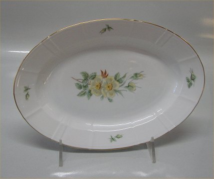 Beskrivelse: Bing & Grøndahl Klitrose 018 Ovalt fad 24 cm (318) Hvidt kantet porcelæn med bred guldkant og klitrose. I hel og fin stand