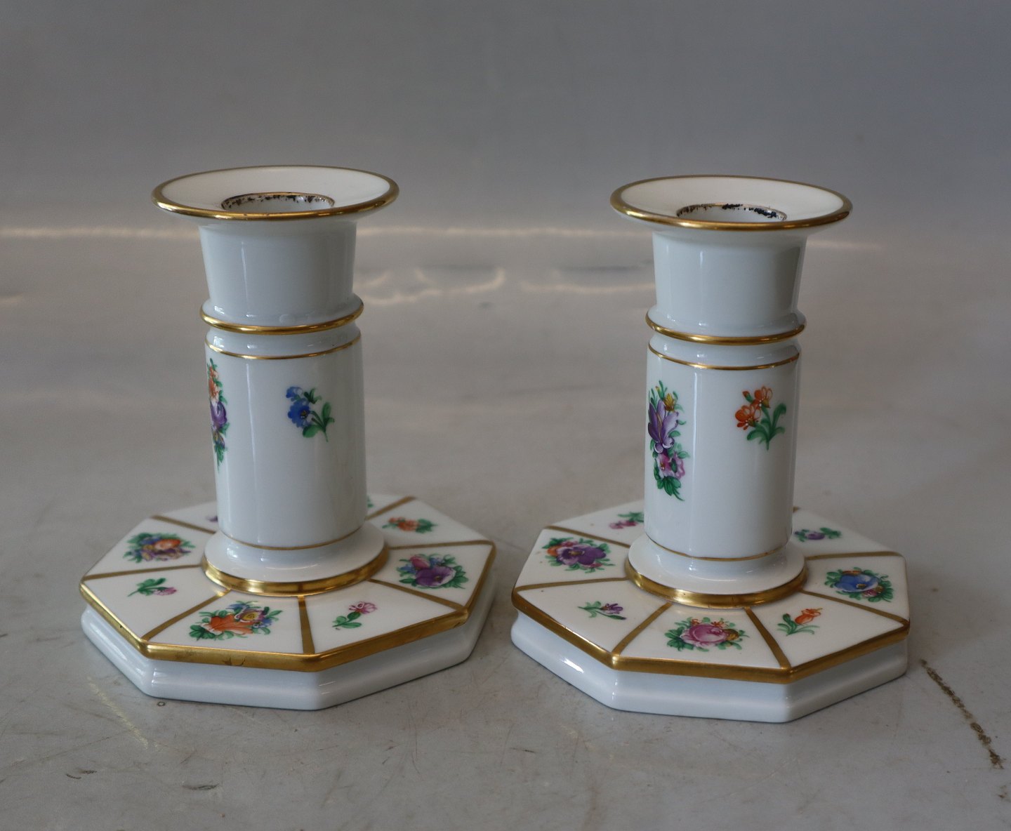 3303-444 Lysestage 11 cm x 9.5 cm Kgl. Henriette # 444 Håndmalet spise- og kaffestel fra Den kongelige Porcelænsfabrik med strøblomster . I fin og hel stand