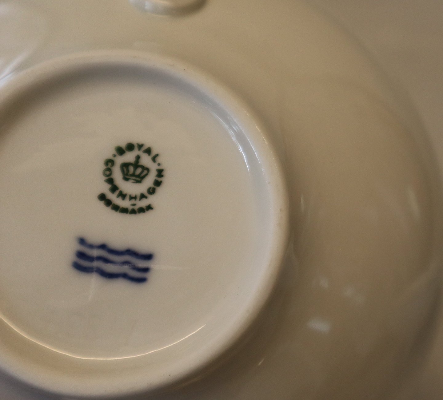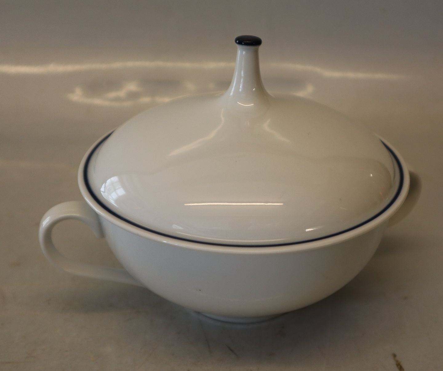 Royal Copenhagen 47-14xxx Suppekop med låg & hanke 18 cm Design Johannes Hedegaard. Samme design som Rimmon med en enkelt blå kant