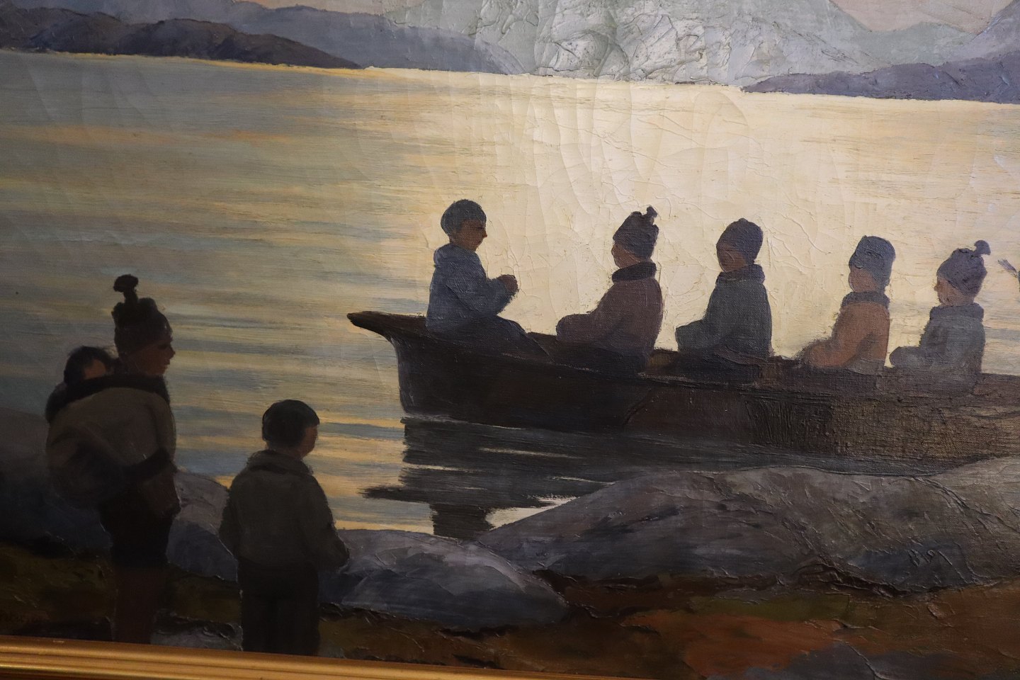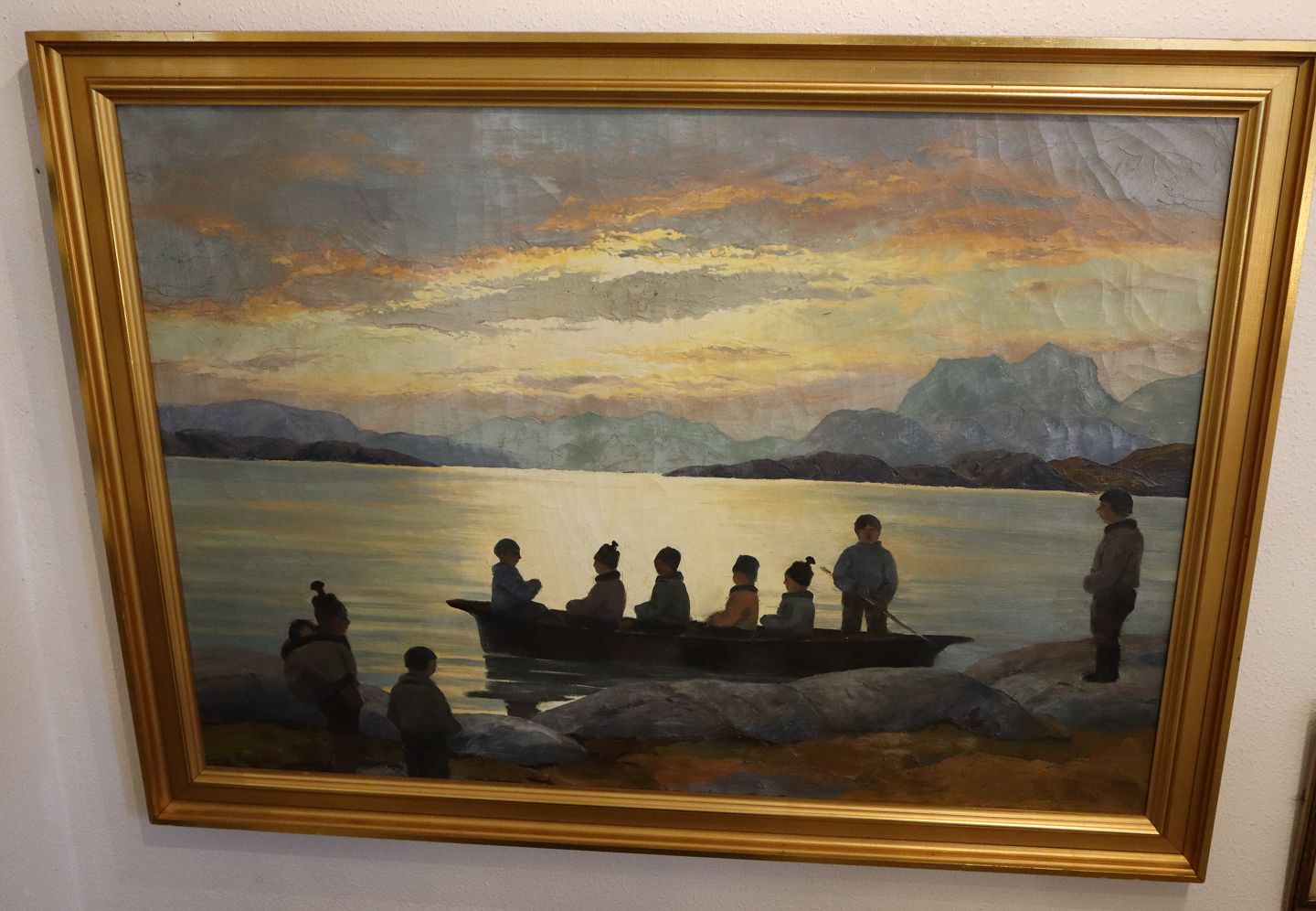 Maleri: Konebåd / Uminaq ved grønlandsk kyst. Olie på lærred 70 x 100 cm Sign. Emanuel A. Petersen.