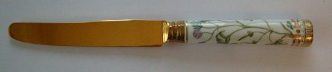 Description: Royal Copenhagen Flora Danica Dinner knife. Gilded with 24k gold over Sterling Silver. Silver is by Georg Jensen and is marked as such, along with a sterling silver mark.