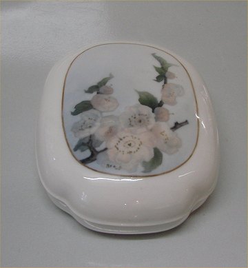 Beskrivelse: Kgl. porcelæn fra Royal Copenhagen RC 1794-8 Bonbon dåse med æbleblomster Før 1900 6 x 15 x 13 cm I hel og fin stand