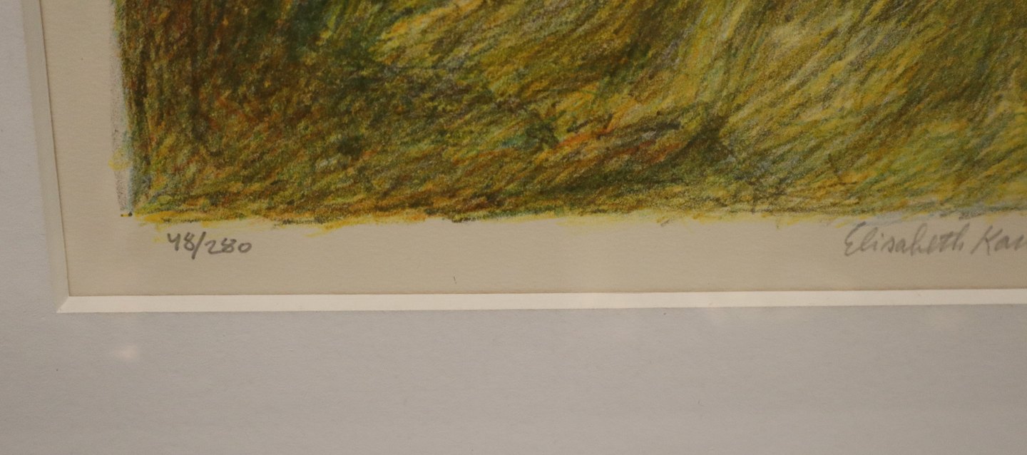 Beskrivelse: Elisabeth Karlinsky Lithografi i glas og guldramme ca 43.6 x 44.5 cm nummer 48 af 280 Lysmål ca 32.5 x 25 cm Signeret