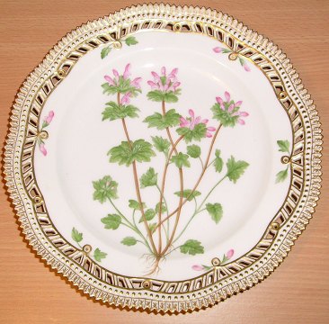Beskrivelse: Royal Copenhagen Flora Danica 20- 3553 "Lamium amplexicaule L." Fad til stor rund frugtkurv, flad spise tallerken med gennemskåret bort (1939) 25 cm Blomstermotiver på guldbelagt perlestel. 1. sortering i fin og hel stand.