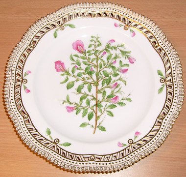 Beskrivelse: Royal Copenhagen Flora Danica 20- 3553 "Ononis procurrens Wallr." Fad til stor rund frugtkurv, flad spise tallerken med gennemskåret bort (1939) 25 cm Blomstermotiver på guldbelagt perlestel. 1. sortering i fin og hel stand.