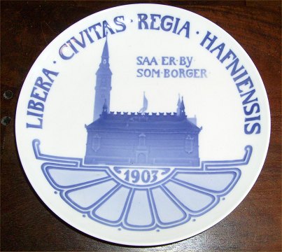 Beskrivelse: Commenrating the dedication of the Town Hall of Copenhagen. Text: Libera Civitas Regia Hafniensis. Saa er by som Borger. 1903 (Thus city is like citizen). Designed by Frederik August Hallin 23.5 cm CM20