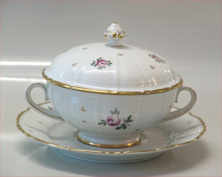 Beskrivelse: Bing & Grøndahl Roselil 247 Bouillonkop med låg 3 dl (481) Hvidt kantet porcelæn med bred guldkant og strøblomster i Henriette stil. Bing & Groendahl mønster på samme form som Offenbach I hel og fin stand