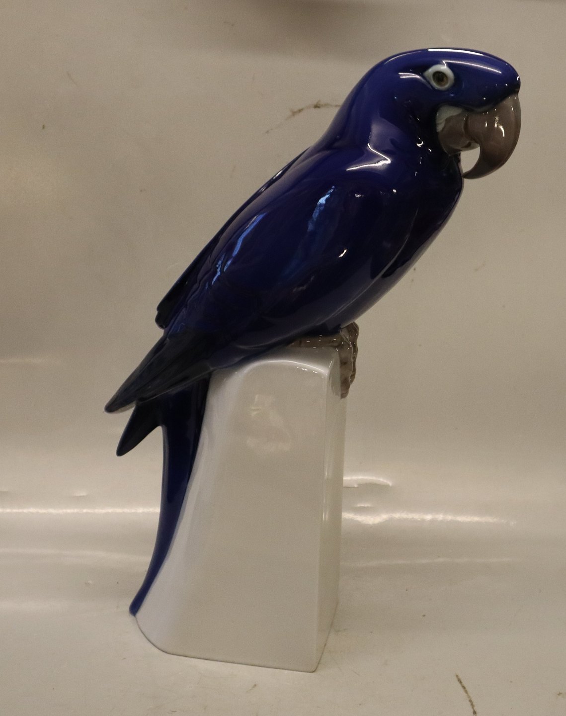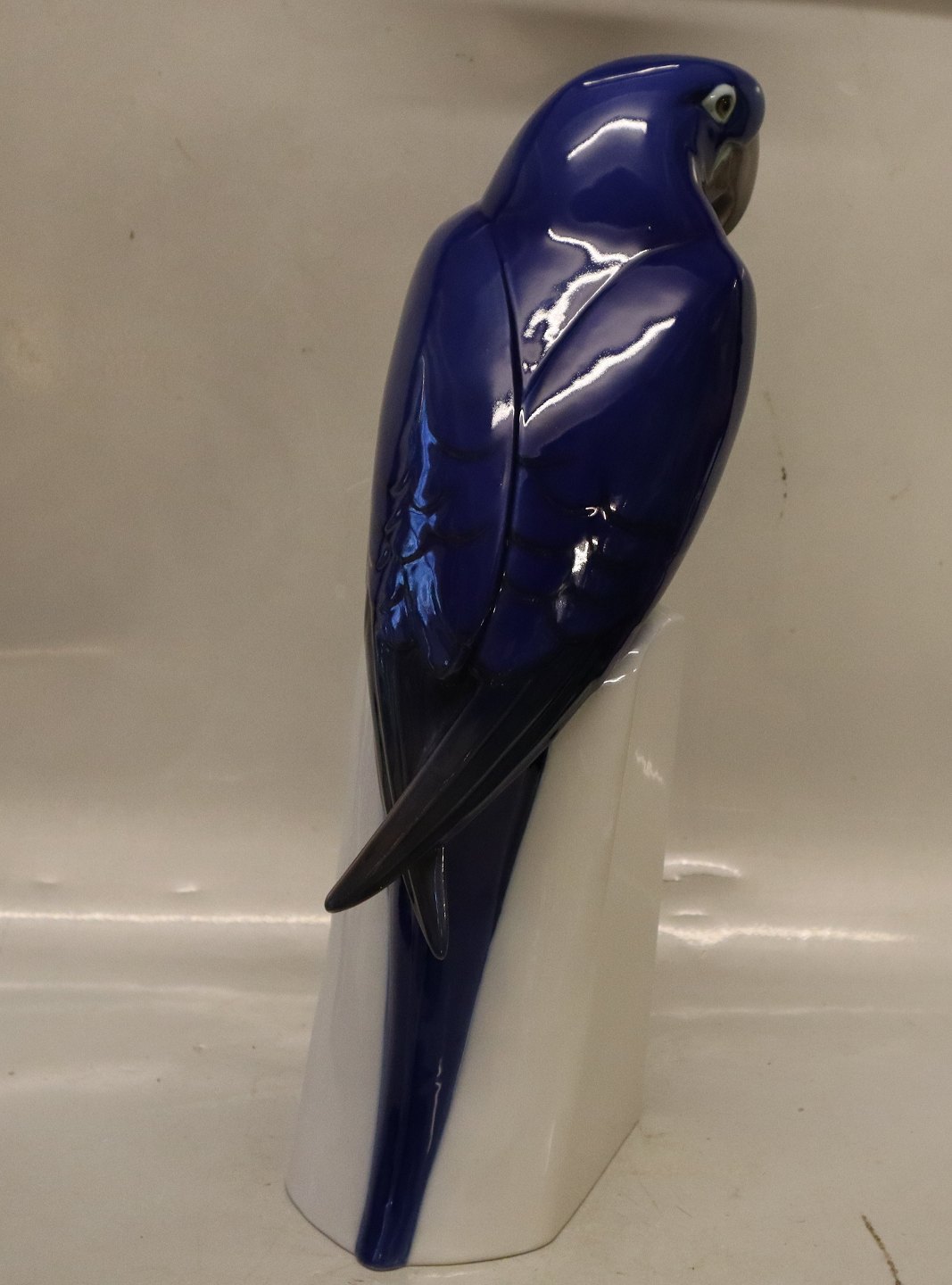 Beskrivelse: Kgl. figur fra Royal Copenhagen fugl 503 Blå Ara. Armand Petersen 41 cm (B&G 2235 ) Papegøjen blev først lavet hos Bing & Grøndahl 2. sortering I hel og fin stand