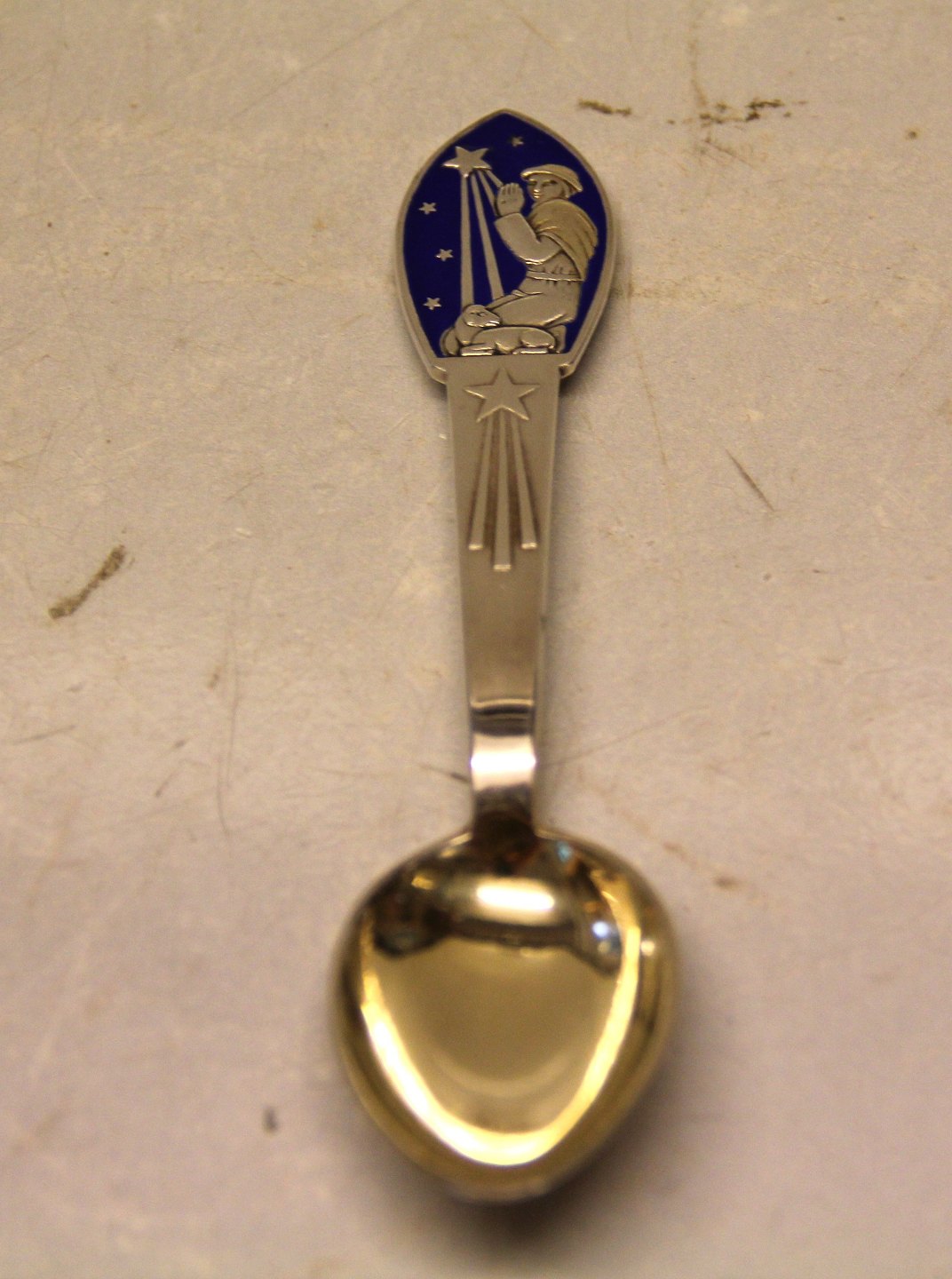 Beskrivelse: Anton Michelsen Juleske 1935 (Se billede 2 og 3) 1935 Knælende hyrde Forgyldt sølv med emaljedekoration. Design: Jais Nielsen Siden 19 10 har forskellige kunstnere designet en årsske ved juletid og siden også en tilsvarende årsgaffel. Juleskeer og julegafler i forgyldt sølv med emaljedekorationer blev først skabt hos sølvfirmaet A. Michelsen og blev i 20 03 overtaget af Georg Jensen. I 20 06 blev gaflen taget ud af produktion