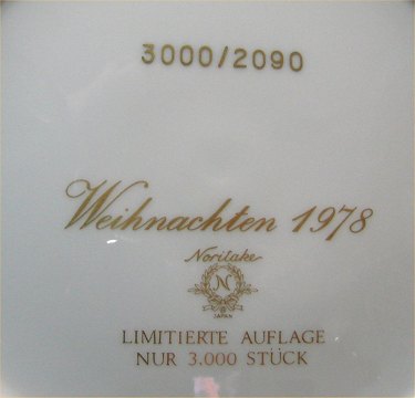 Beskrivelse: Noritake, Japan, Juleplatter Følgende på lager: brun 1975, grøn 1976, blå 1977, brun 1978, grøn 1979, blå 1980 Begrænset oplag på 3000 Weihnachten Limitierte Auflage Nur 3000 Stück