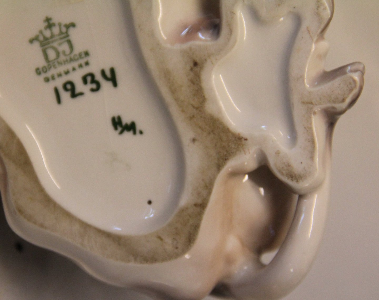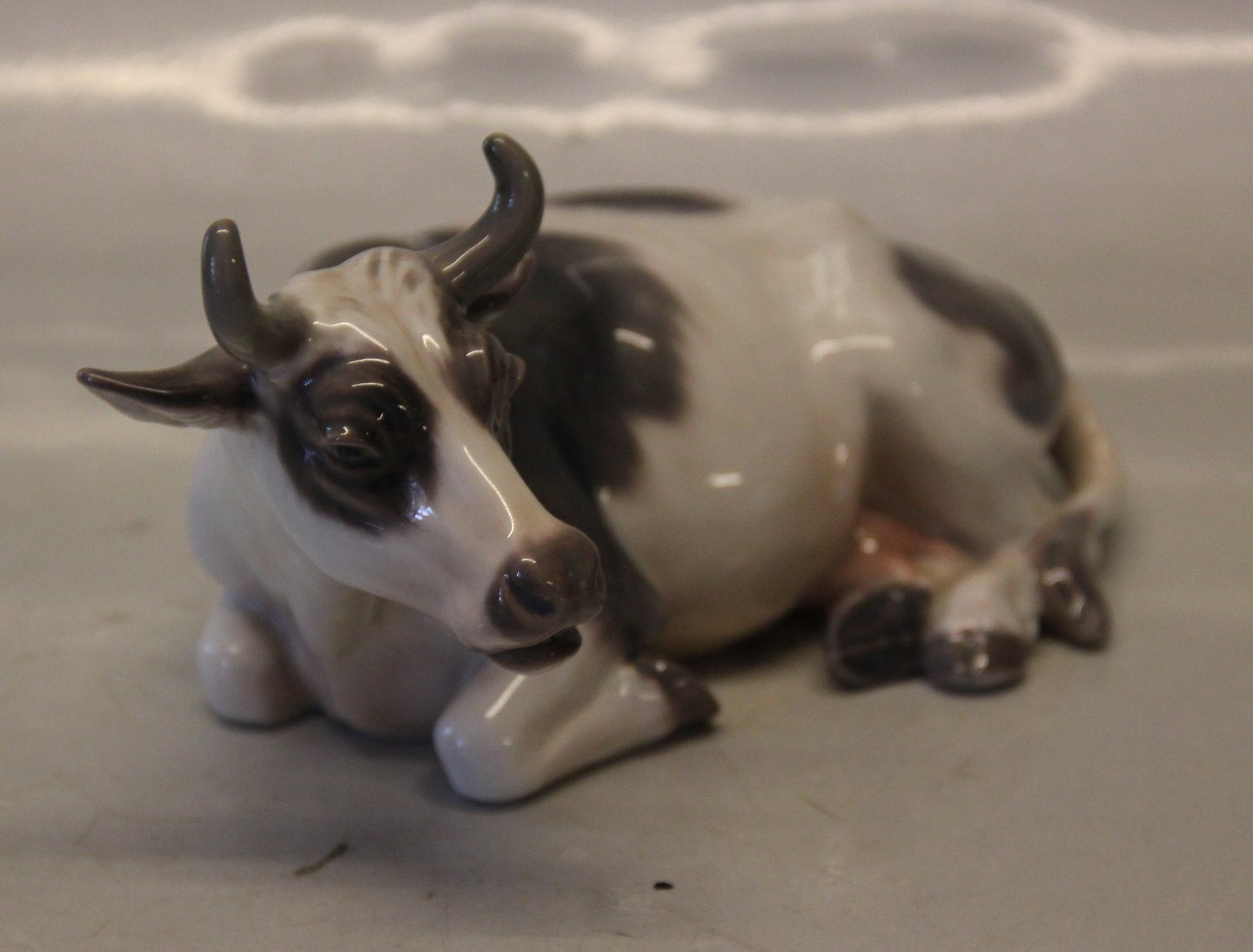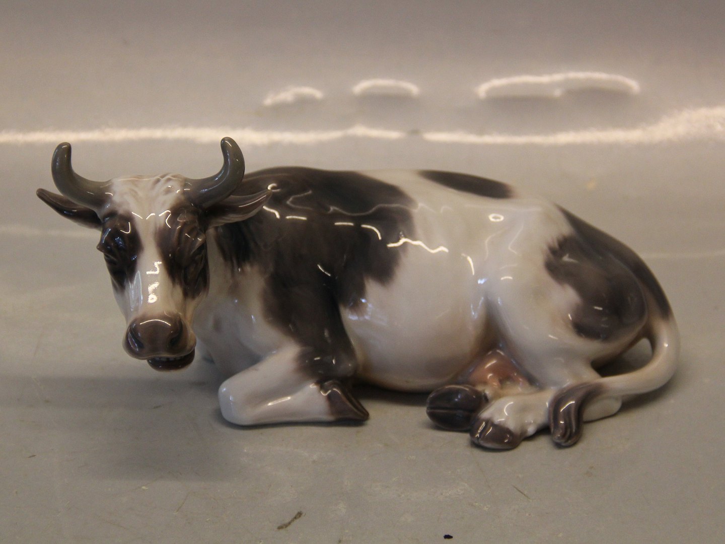 Beskrivelse: Dahl Jensen 1234 Liggende ko 10 x 20 cm 1. Mærket med kongelig krone og DJ Copenhagen i hel og fin stand. Køer. kvæg, Malkeko Sortbroget