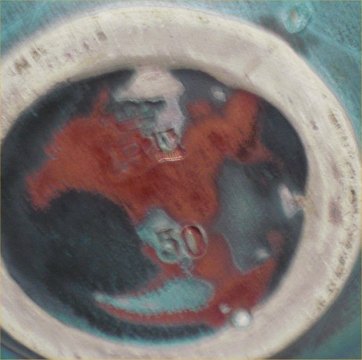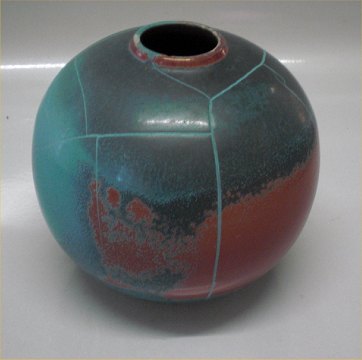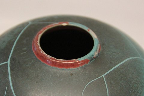 Beskrivelse: 50 Kuglevase med Danit-glasur 15 cm Axel Sørensen 1933 Keramik fra P. Ipsens Enke Kgl. Hof. Terracottafabrik 1843-1955